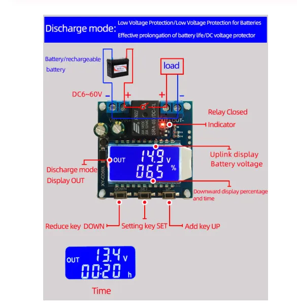 Установив верхний предел напряжения вверх и нижний предел напряжения dn; Когда напряжение батареи больше или равно верхнему пределу напряжения вверх, реле включается и начинает разрядку; когда напряжение батареи меньше или равно низкому предельному напряжению dn, Реле выключается и завершает функцию автоматической разрядки; Когда реле включается, выход мигает, указывая, что он разрядится.
