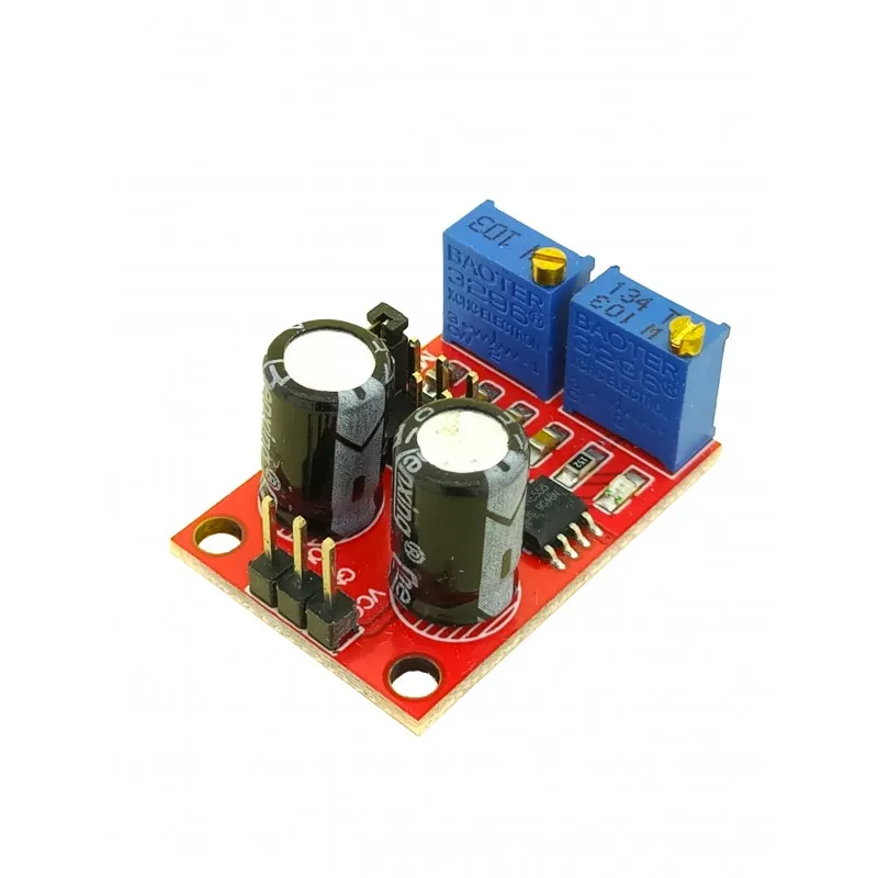 Модуль регулируемого генератора прямоугольных импульсов на чипе NE555. Красный светодиод подключен на выход генератора и мигает при малой выходной частоте. Триммерами регулируется длительность паузы импульса, и период следования импульса. Характеристики: Входное напряжение: 5В-15В DC. Если напряжение питания 5В , выходной ток может быть не больше 15мА ; если напряжение питания - 12В, то 35мА.Входной ток: >=100мАВыходная амплитуда: 4.2В V-PP - 11.4В V-PP. (Зависит от напряжения питания)Режимы работы (выставляются перемычками)LF: 1Hz ~ 50HzIF: 50Hz ~ 1kHzHigh-frequency: 1KHz ~ 10kHzHF: 10kHz ~ 200kHz