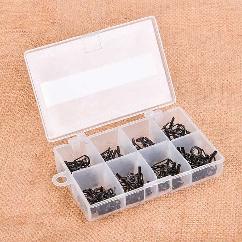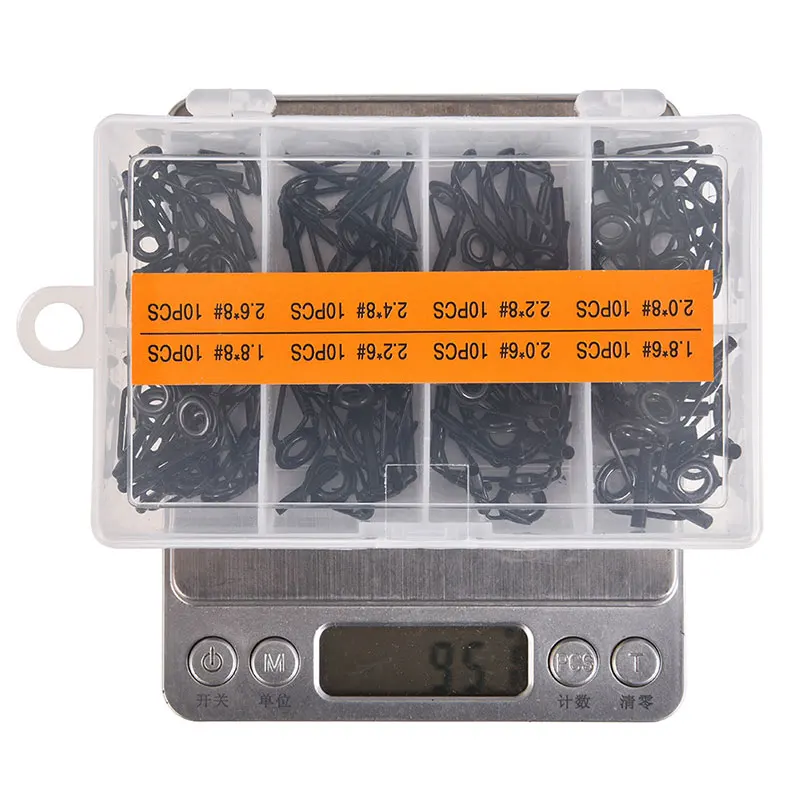 1. Material: Made of high-quality stainless steel and double ceramic fishing rod guide ring, strong and durable. 2. Safety: The straight fishing rod guide can greatly reduce the risk of damaging the fishing line. 3. Selection: 1 box has 80 fishing rod guide rings of different sizes, and the angler can choose the guide ring of suitable size for repair according to different fishing rods. 4. Applicable to: Used for rotating fishing rods, telescopic fishing rods and most of the daily fishing rods. 5. Storage: Provide plastic box packaging, easy to store. 6. Note: The surface of this guide ring is black oxidized, which is more suitable for black fishing rod bodies.