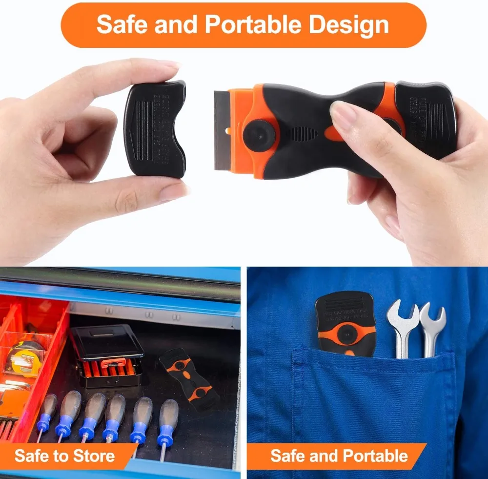 Экономьте деньги для вас: «2 в 1» для снятия наклейки скребок отвечает вашим различным потребностям чистки, вам не нужно купить дополнительный Скребки. Экономьте усилия для вас: Маленькая противоскользящая ручка обеспечивает хороший комфорт и позволяет легко и удобно чистить. Экономьте время для вас: Вы можете легко заменить лезвие, ослабив ручку на скребок и открыв верхнюю крышку. Безопасная защита для вас: Каждый скребок для удаления наклеек оснащен безопасной пластиковой крышкой с обеих сторон, которая Удобно для хранения и переноски.