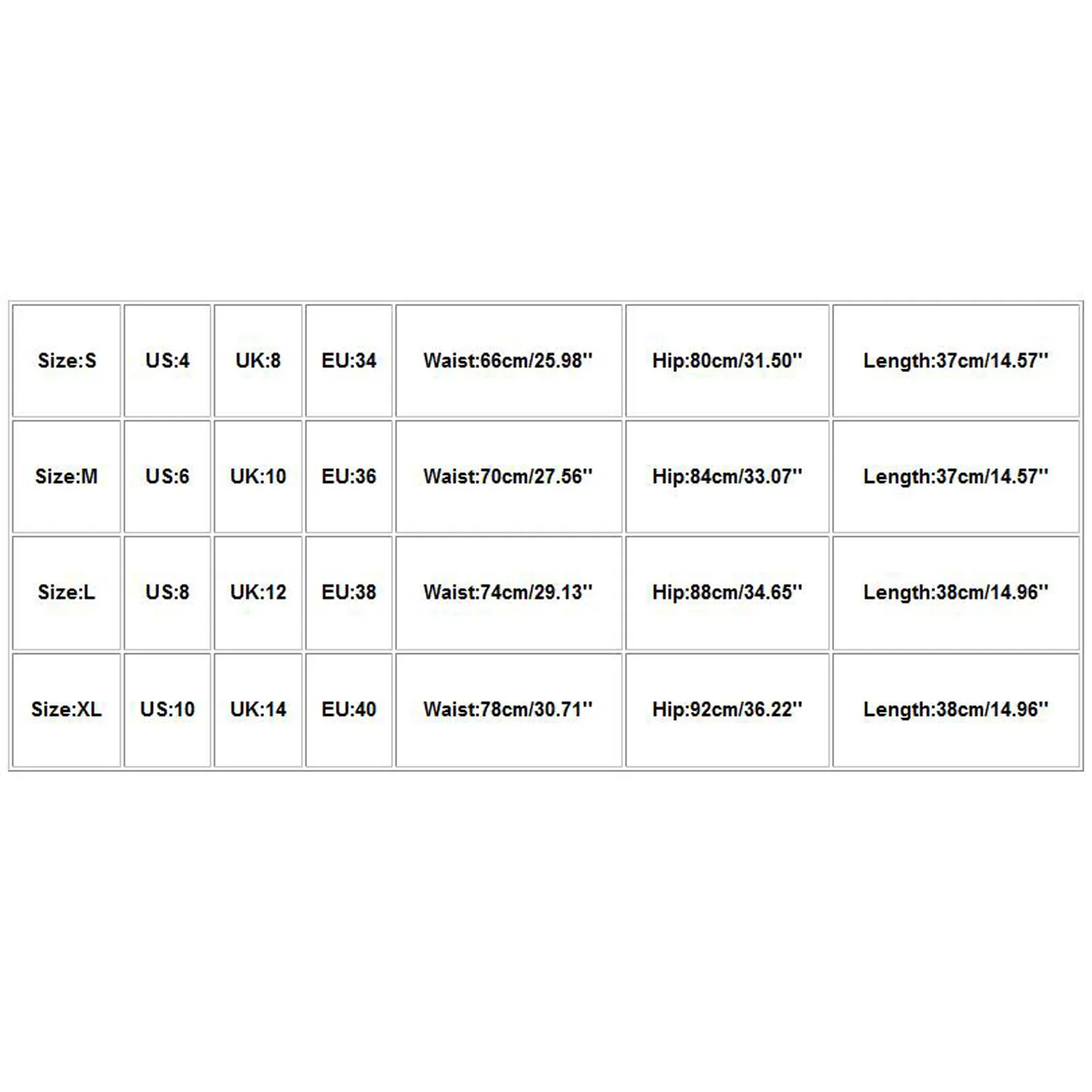 Размеры США UK ЕС Талия Бедра Длина S 4 8 34 66 см/25,98 дюйма 80 см/31,50 дюйма 37 см/14,57 дюйма М 6 10 36 70 см/27,56 дюйма 84 см/33,07 дюйма 37 см/14,57 дюйма L 8 12 38 74 см/29,13 дюйма 88 см/34,65 дюйма 38 см/14,96 дюйма XL 10 14 40 78 см/30,71 дюйма 92 см/36,22 дюйма 38 см/14,96 дюйма