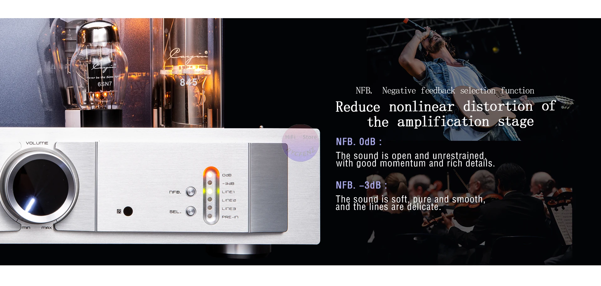 Отрицательный отзывы-переключатель на передней панели, который вы можете выбрать между двумя уровнями NFB, чтобы насладиться различными звуковыми выходами усилителя A-845 PLUS. Под состоянием 0 дБ он имеет открытый звук с более подробной информацией, в то время как для-3 дБ A-845 плюс выводит мягкий, чистый звук.