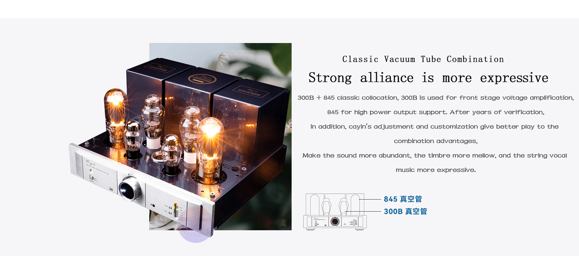 Все трубы интегрированы с 6SN7 этап усиления напряжения, 300B драйвер трубы и 845-CYB Выход трубы.