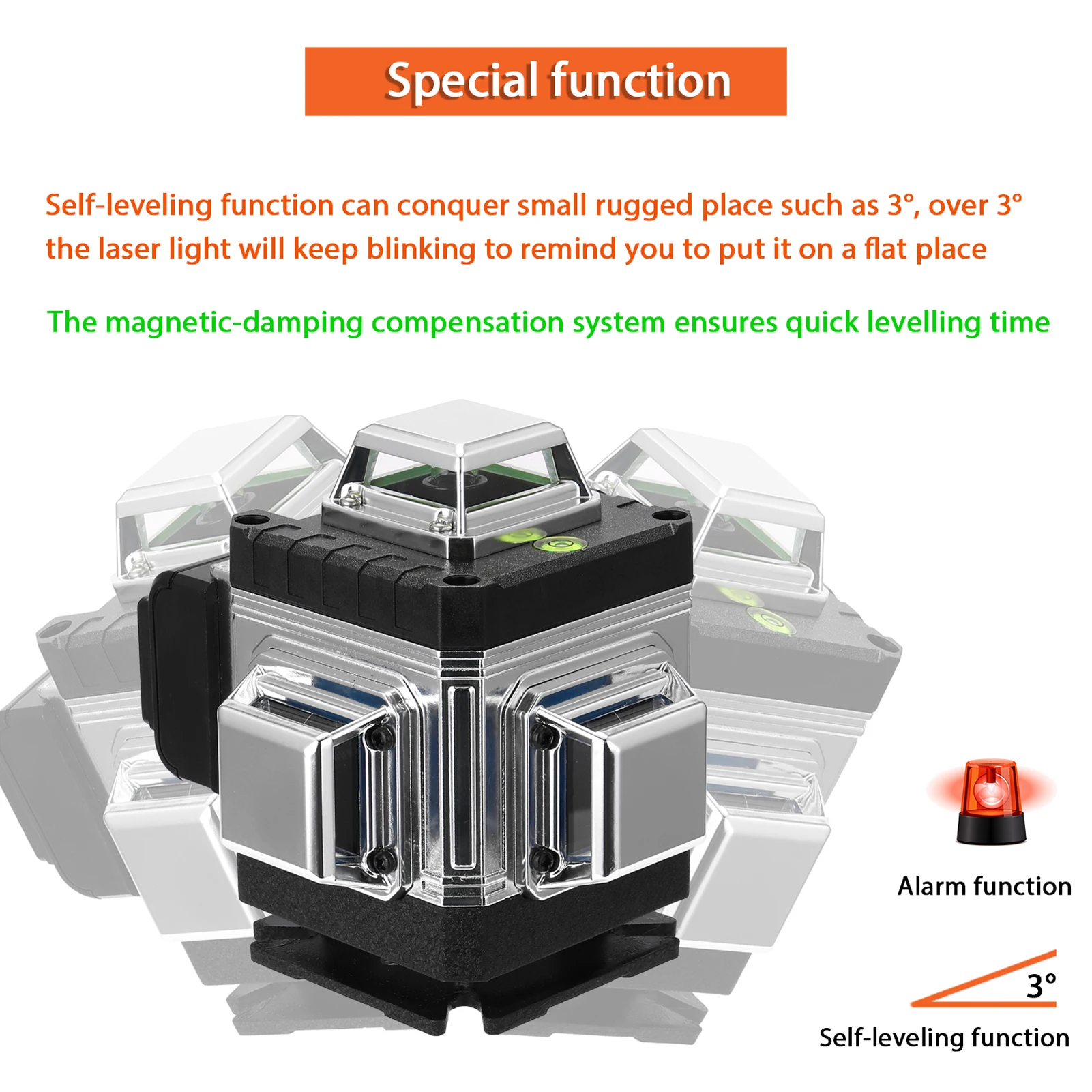 Это своего рода инструмент высокого качества, 16 линий для более точного позиционирования, с самонивелирующейся системой, гибкостью и стабильностью. С вертикальными и горизонтальными лазерными линиями, удобство в использовании. Идеально подходит для различных видов применения, включая напольное покрытие, плитку, обшивку, обшивку стен, обшивку стенок, обшивку, отделку столярных изделий, розетку и раскладку переключателей, обшивку стен и установку перегородок. Вы можете попробовать.