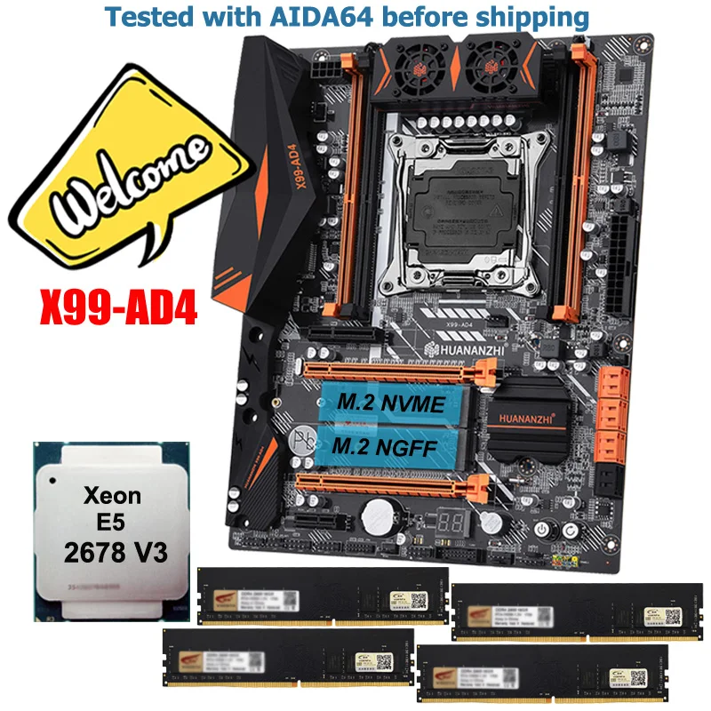 HUANANZHI X99-AD4 LGA2011-3 материнская плата с двойным M.2 слотом SSD + CPU Xeon 2678 V3 + 4*16G DDR4 2400 память + кабель SATA + металлический задний щит + диск драйвера + Руководство пользователя + кулер для процессора