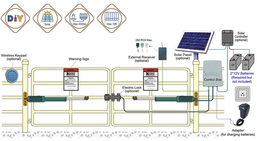 Может быть подключен к Солнечной системе, с помощью домашней цепи или на солнечной энергии. Обратите внимание, что мы не можем транспортировать батареи и должны подготовить батареи самостоятельно.