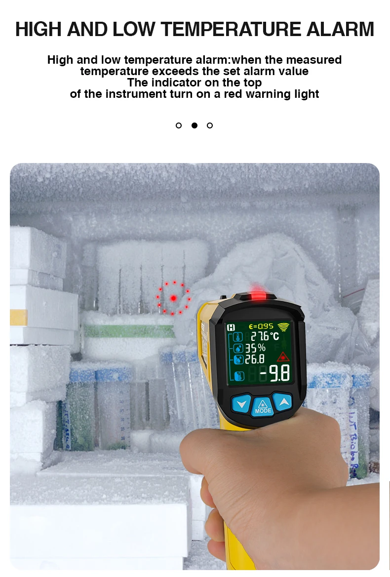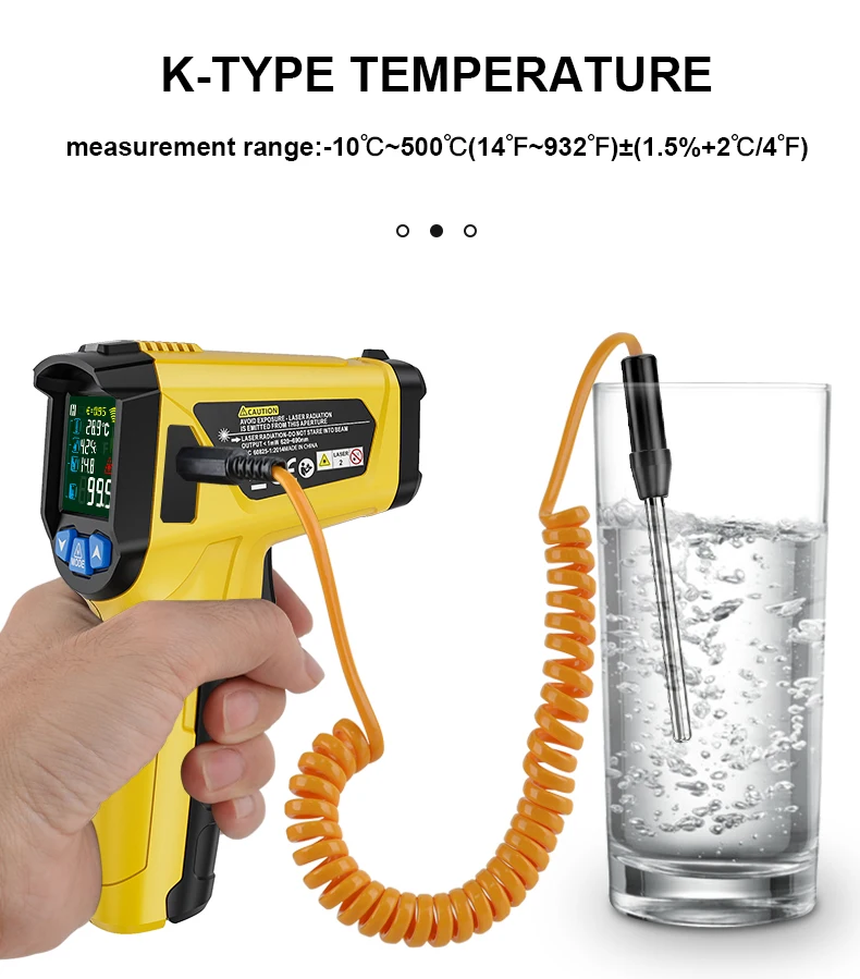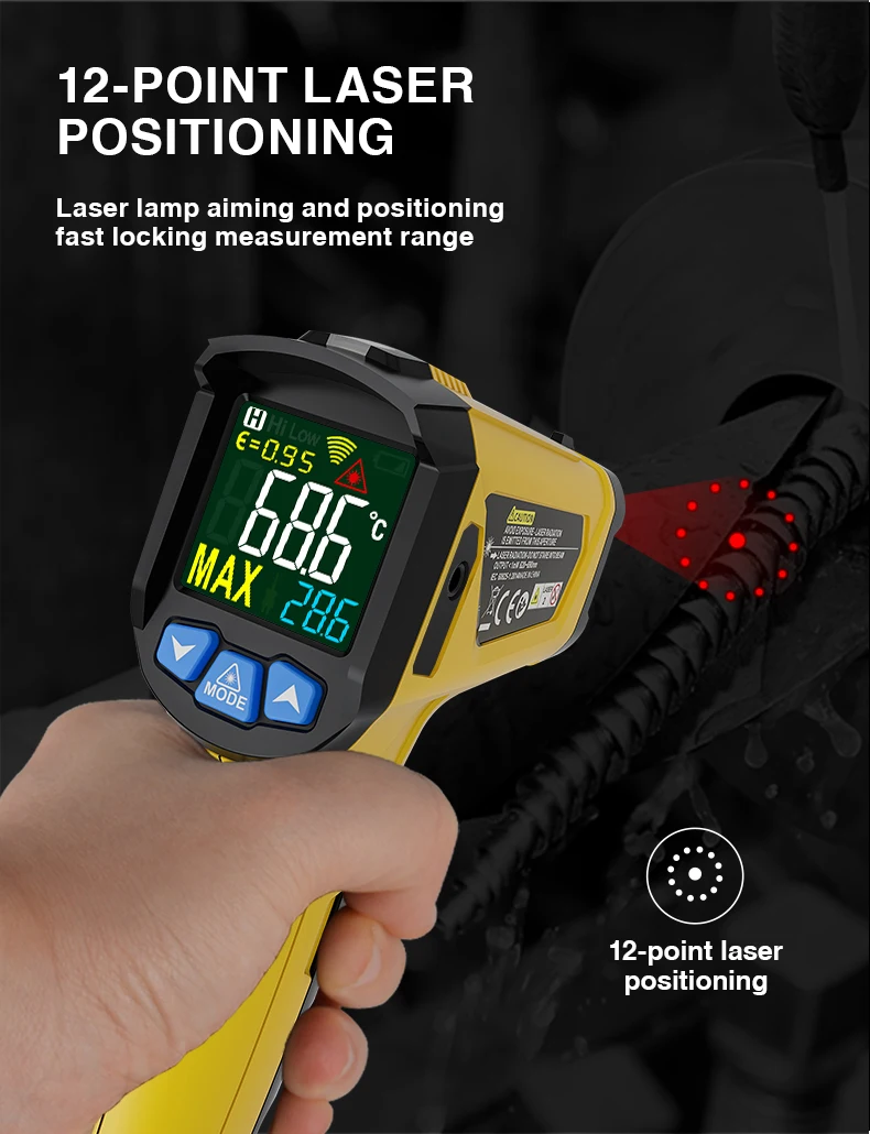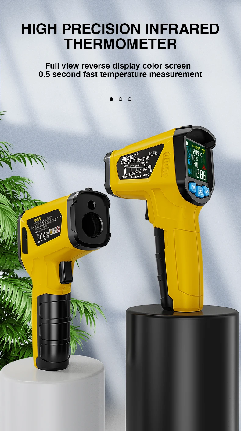 1. Бесконтактный промышленный термометр с 12 точками температуры 2. Сигнал тревоги разности температур, максимальное и минимальное значение можно установить 3.800B,800C с контактным зондом, может точно измерять температуру жидкости 4. Другие функции: температура плесени, температура точки росы (только для 800C)