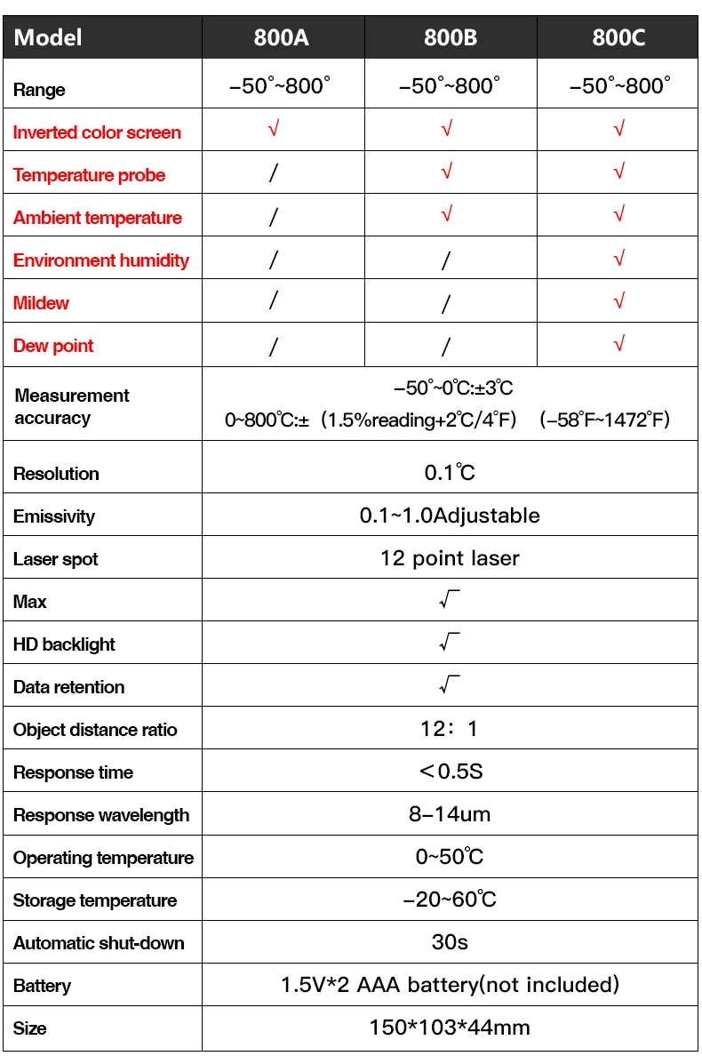 Примечание: батарея в комплект не входит Модель: 800A.800B.800C Диапазон измерения температуры: 800A:-50 ~ 800C 800B:-50 ~ 800C, с температурным зондом 800C:-50 ~ 800C, с температурным зондом, температура окружающей среды:-10 ~ 60C, влажность окружающей среды: 0% ~ 100% RH плесени и температуры точки росы D:S : 12:1 Излучение: 0,1 ~ 100 регулируемая Диапазон отклика: 8 ~ 14 мкм Лазерное позиционирование: 12 точечное кольцо, указывающее температуру чувствительной зоны Лазер:<1 мВт/630-670нм Уровень 2 Время отклика:<0.5s Автоматическое выключение: 30 секунд