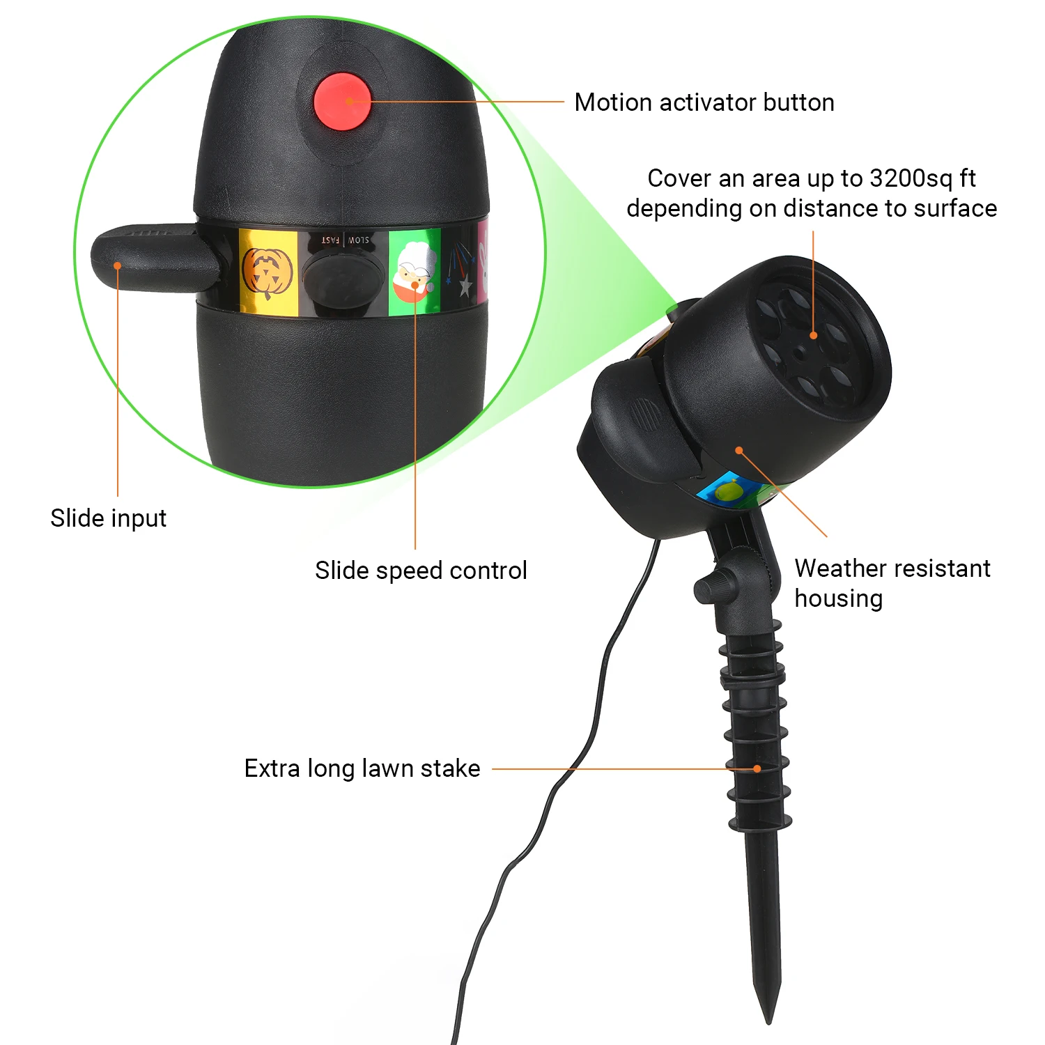 С длинной коллой для газона и базой для проектора, которая поможет вам закрепить ее на месте, подходит для использования в помещении и на улице.
