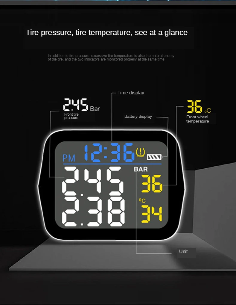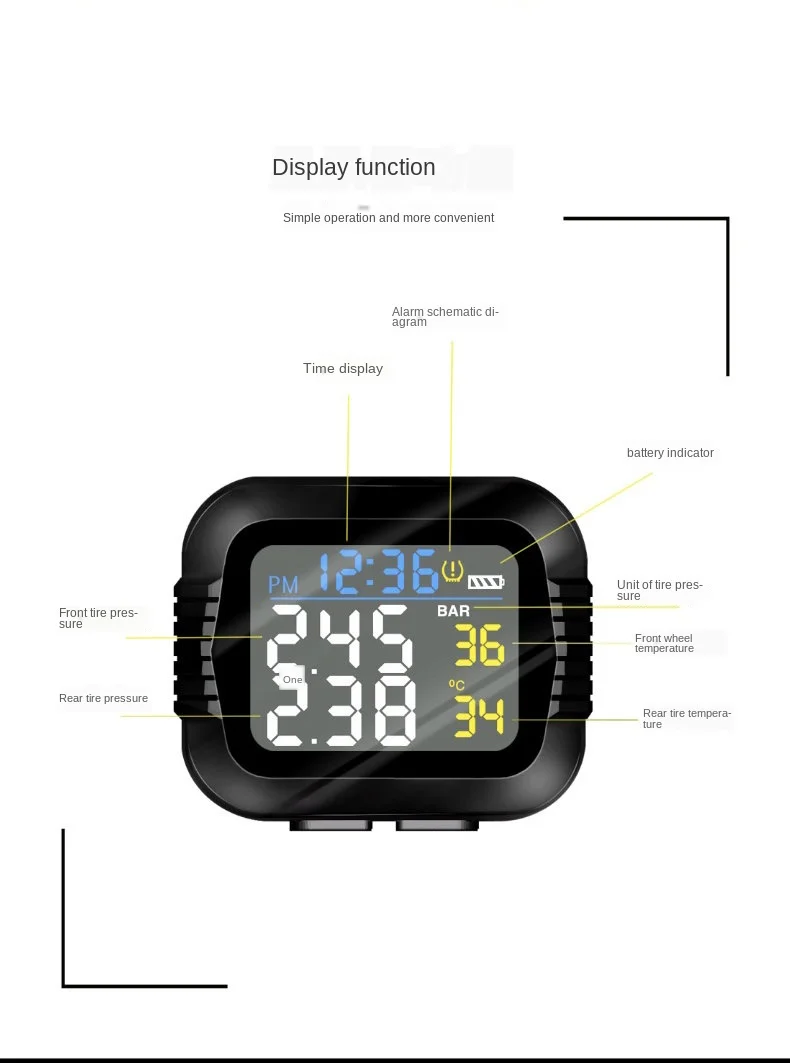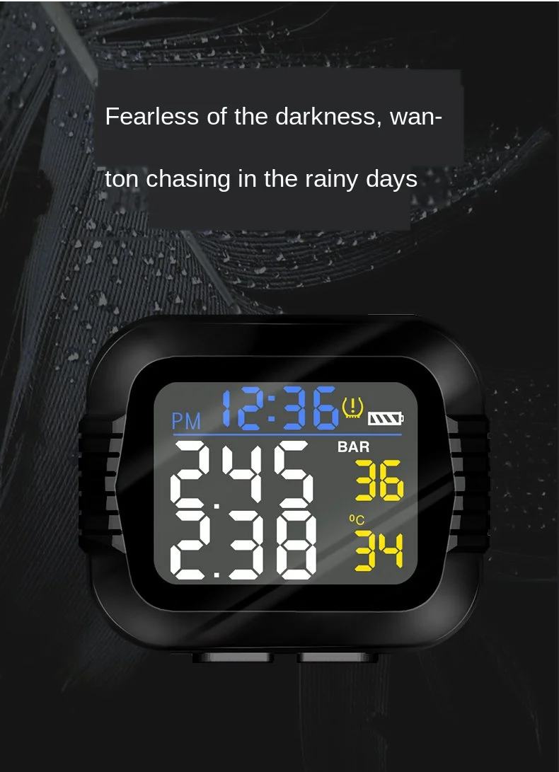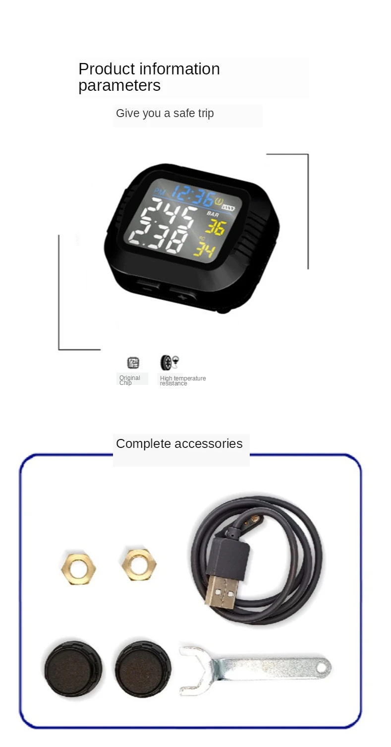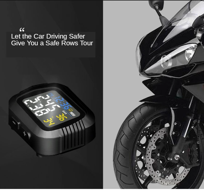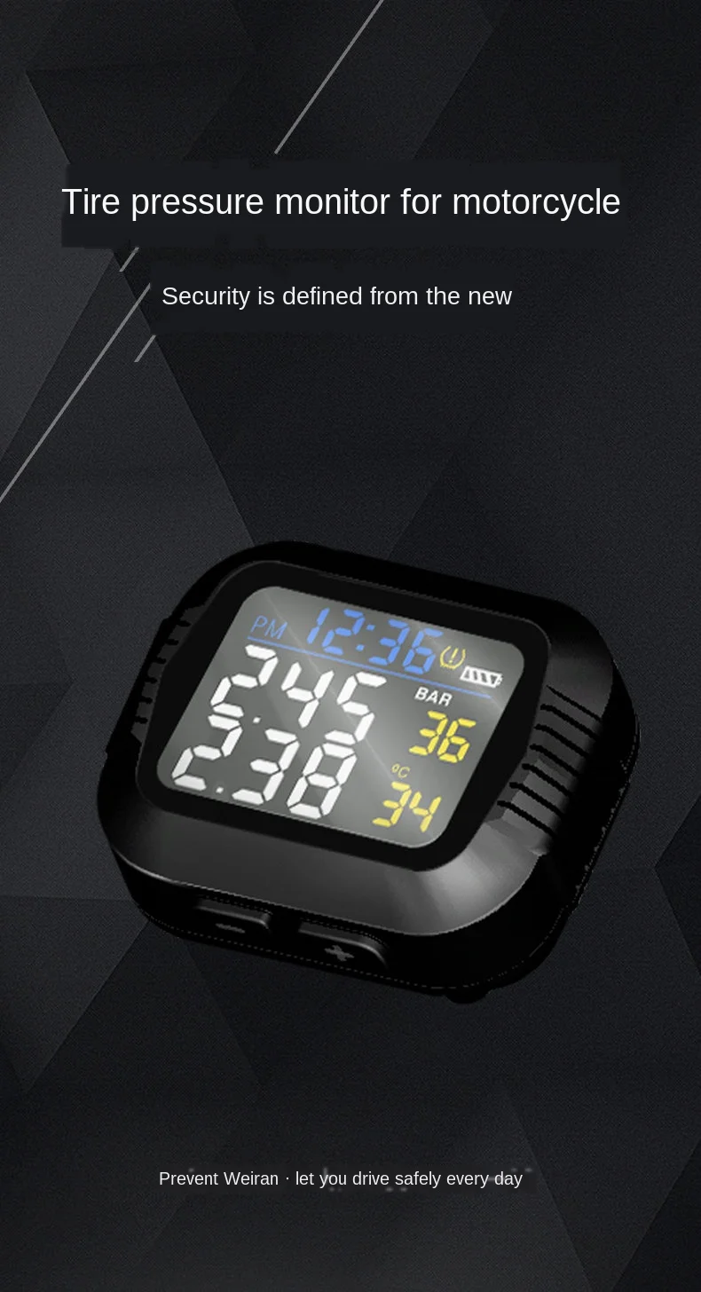 Мотоцикл TPMS система мониторинга давления в шинах 2 Внешний датчик беспроводной ЖК-дисплей мото авто шины сигнализация Система s Примечание: кнопка является водонепроницаемым дизайном, пожалуйста, используйте силу, чтобы нажать клавишу загрузки или установить кнопку ключа для отладки. Особенности: ЖК-дисплей, водонепроницаемый и пылезащитный Мониторинг в реальном времени, индивидуальные данные шин показали. Беспроводная передача, не требуется подключение проводов. Визуальная и звуковая сигнализация. Утечка шин, Высокое/низкое давление и высокая температура сигнализации. Общие сведения: Характеристики: Датчик: Рабочая частота: 433,92 МГц ± 15 МГц Рабочее напряжение: 2,1-3,3 V Рабочая температура. : -40 - + 105 ℃ Диапазон давления: 0-8 бар/0-116psi Размер датчика: 23 мм * 15 мм (WF) / ! 8 мм * 13 мм (WI) Дисплей: Рабочая частота: 433,92 ± 15 МГц Тип батареи: Встроенный с литиевой батареей USB кабель питания для зарядки Размер дисплея: 48 мм * 48 мм * 27 мм Посылка: 1 * монитор 2 * внешний датчик 1 * держатель 1 * USB кабель питания 2 * батарейный ключ 2 * Анто-защитные гайки 1 * гаечный ключ