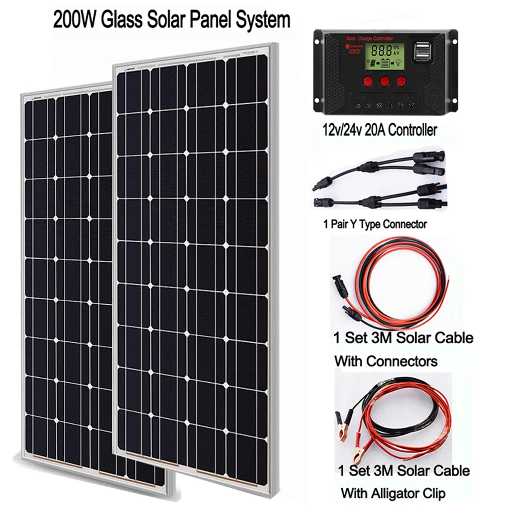 200W Solar Panel System :2*100W Glass Solar Panel, 1*20A Solar Controller ,1 Set 3M Cable With Connectors.1set 3M Solar Cable With Alligator Clip.1 pair Y type connector.