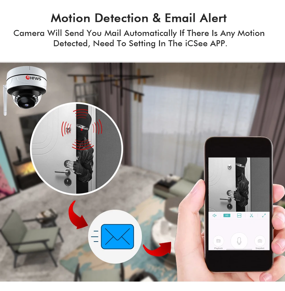 Поддержка записи видео при обнаружении движения, Немедленно отправьте информацию о тревоге на мобильный телефон, если есть аномалия