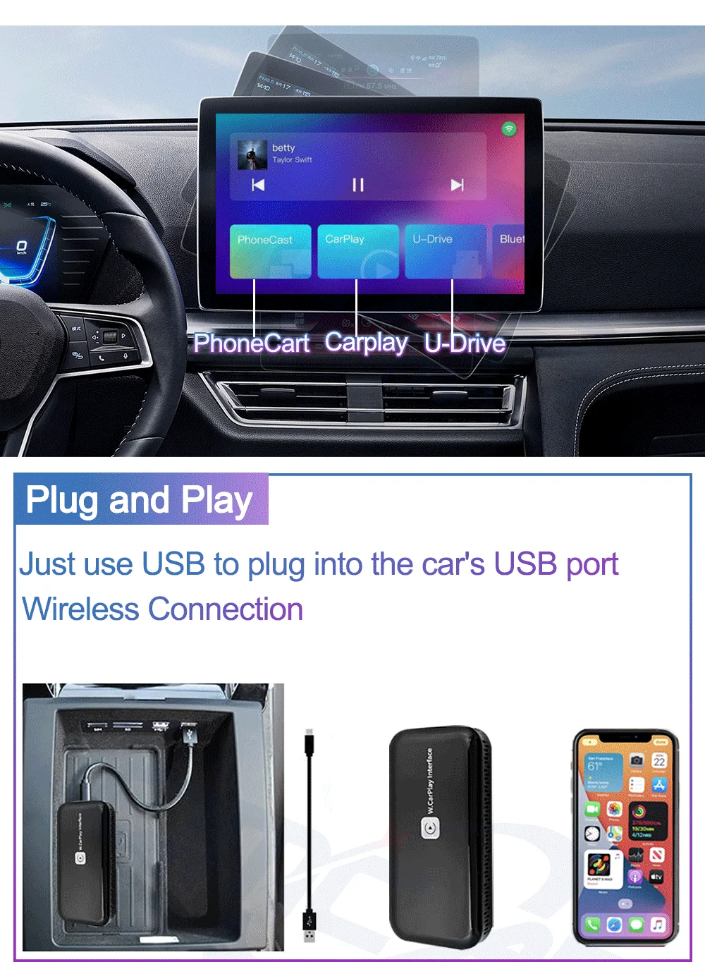 2. Используйте-вставляя наш продукт в автомобильный usb-порт, наслаждаясь беспроводным apple carplay на дороге