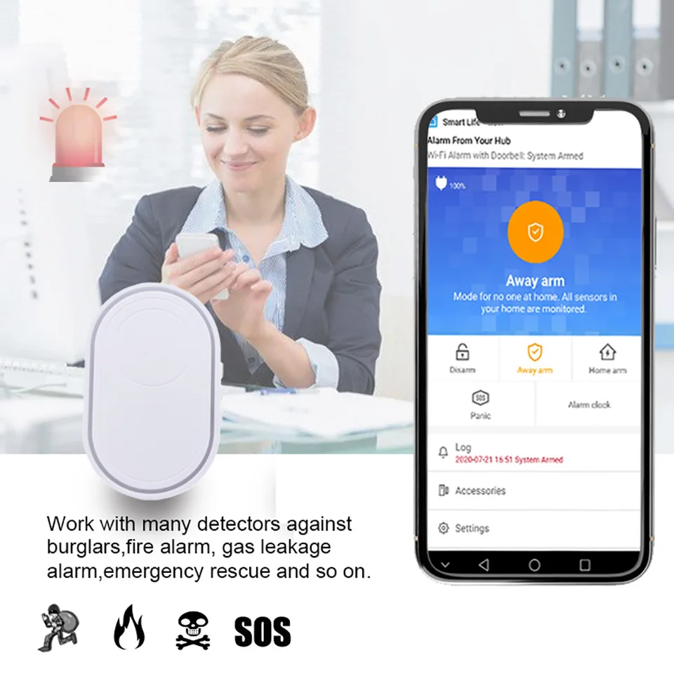 Преимущества:-Уведомление приложения, вы можете получить будильник в любое время и в любом месте-С локальным голосовым сигналом и светодиодный мерцающим уведомлением, 5 уровней громкости можно регулировать, 58 песен по желанию-Популярное бесплатное приложение Smart Life и Tuyasmart Наслаждайтесь большой и стабильной системой умного дома, не требуется концентратор-Легко носить с собой, супер светильник, удобный материал-Легко сделать своими руками свою собственную систему сигнализации, поддерживает максимум 100 шт. 433 МГц датчиков и 10 шт. пультов дистанционного управления (датчики и контроллеры не входят в комплект)-Arm / Disarm / Away arm / Home arm / Timer обеспечивают наиболее удобный режим для вас-Поддержка приложения: английский, русский, испанский, португальский, французский, немецкий, итальянский и т. Д.-Поддержка Alexa, Google HomeХарактеристики:-Технические параметры: Кнопка SOS (433 МГц, EV1527, 430K), Wi-Fi хост (подключение 433 МГц датчиков, Подключение 2,4G WIFI)-Режим работы: сигнал SOS отправляется на Wi-Fi хост, Wi-Fi хост отправляет уведомление на смартфон через приложение, а также с локальным голосовым сигналом и светодиодный мерцающий-2,4G WiFi подключение напрямую (не поддерживает 5G WiFi)-SOS для приема сигнала хоста: 80 метров (открытая площадь), от 15 до 30 метров в помещении-Батарея SOS: 1 единица батареи CR2032 (в комплекте), батарея может работать более 6 месяцев-Приемник Питание AC 110/220V, включают в себя 300mAh резервного копирования литиевая батарея, работа более 5 часов, мы вышлем адаптер питания, как в вашей стране-Рабочая температура: от-20 ℃ до 55 ℃-Цвет: как на фото-Гарантия 12 месяцев