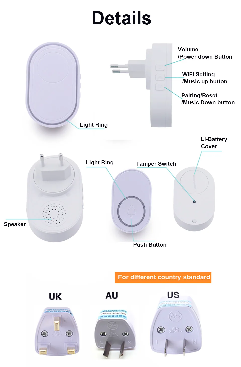 -С локальным голосовым сигналом и светодиодный мерцающим уведомлением, 5 уровней громкости можно регулировать, 58 песен по желанию-Эта система не включает кнопку