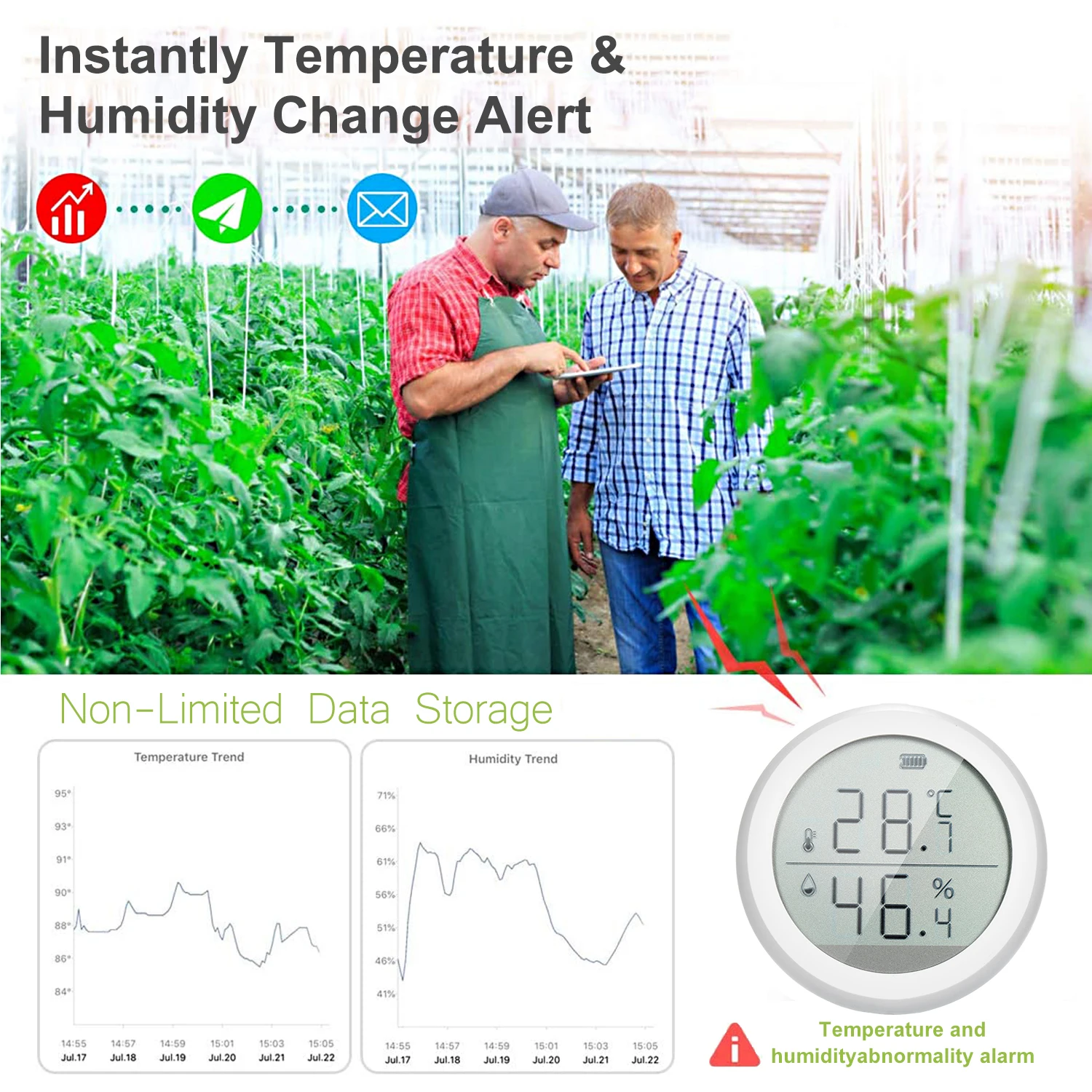 Высокоточный монитор-со встроенным датчиком высокой чувствительности, он обеспечивает Высокоточный Мониторинг. Диапазон температур: -10-55 ℃ Диапазон влажности: 0-99.9% RH. Температуру с точностью до ± 0,5 ℃, в то время как влажности составляет ± 5% относительной влажности.