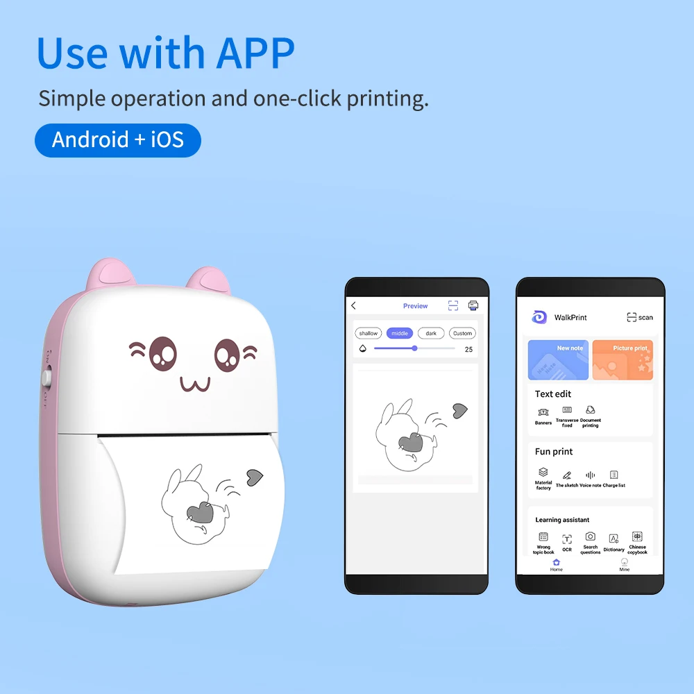 Используйте с приложением:Подключите приложение (WalkPrint) BT, совместимо с системами Android и IOS. Функция быстрого распознавания OCR, вы можете получить текстовое содержимое, сделав фотографии.