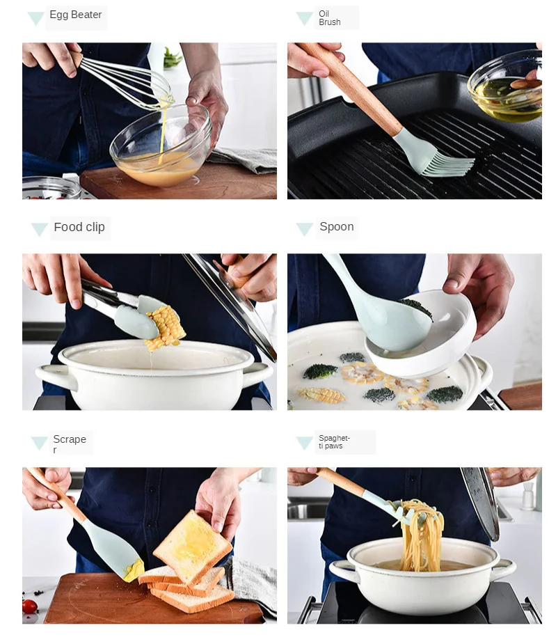 Features: Environmental protection, non-toxic, heat Resistant,non-stick, durable, safe, easy to clean products for the kitchen kitchen cookware Suitable: Microwave oven, toaster, steamer,can be boiled and sterilized. Material: Silicone + Natural Acacia Wooden Color: Green,Gray,Pink,Mint Green,Red Size:As photo show