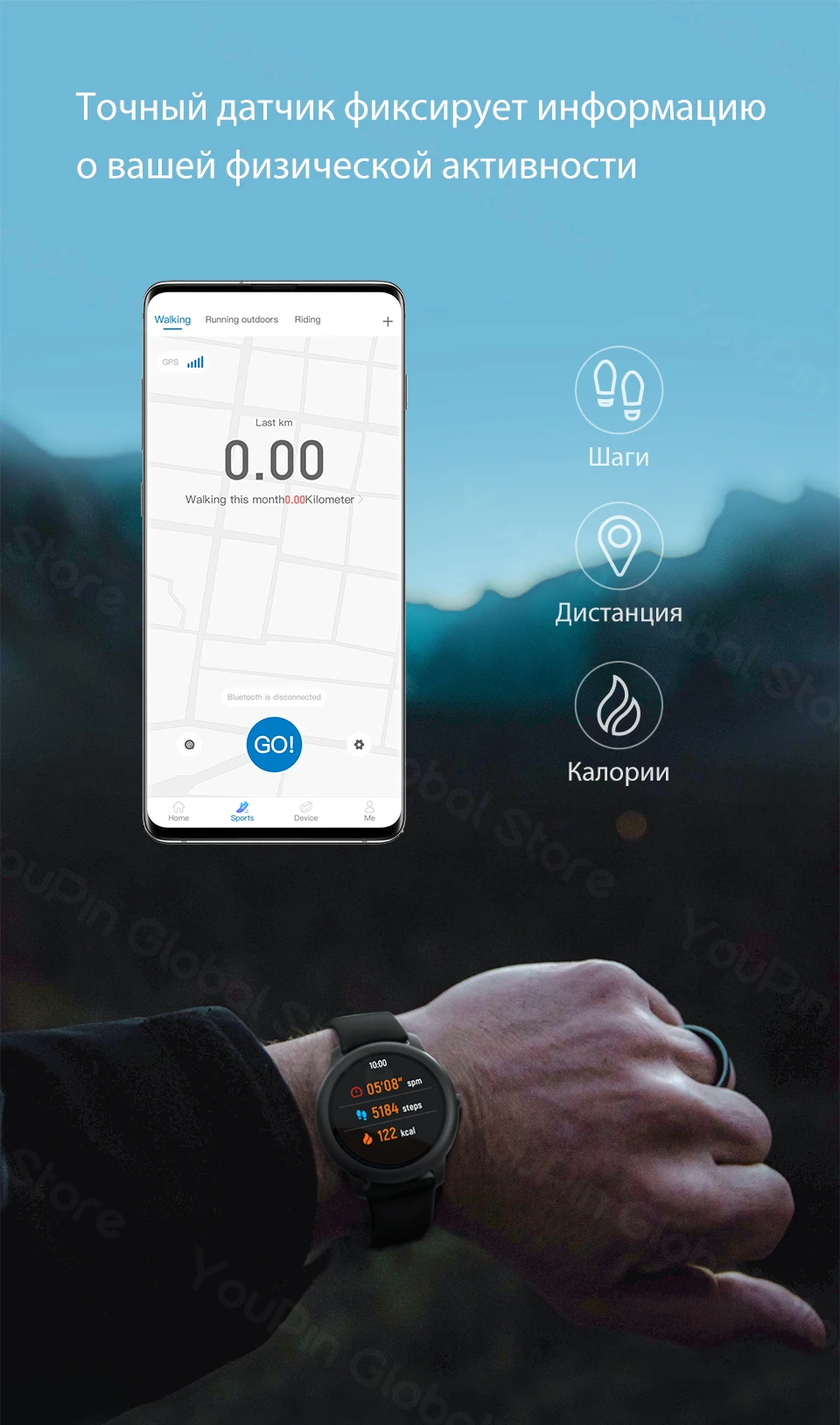 ------ 12 спортивных режимов. Теперь вы можете лучше понимать свое тело, просматривая количество пройденных шагов, дистанцию и число сожженых калорий. ------