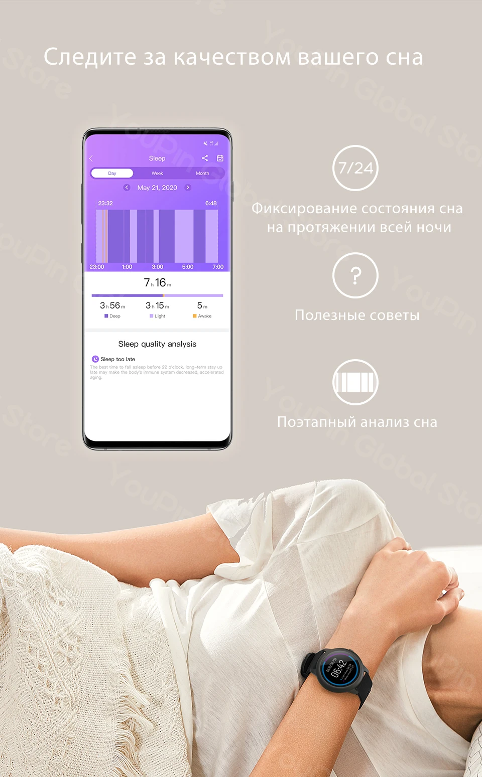 ------ Часы могут следить за качеством вашего сна: фиксировать циклы и моменты пробуждения, помогая улучшить ваше время отдыха. ------