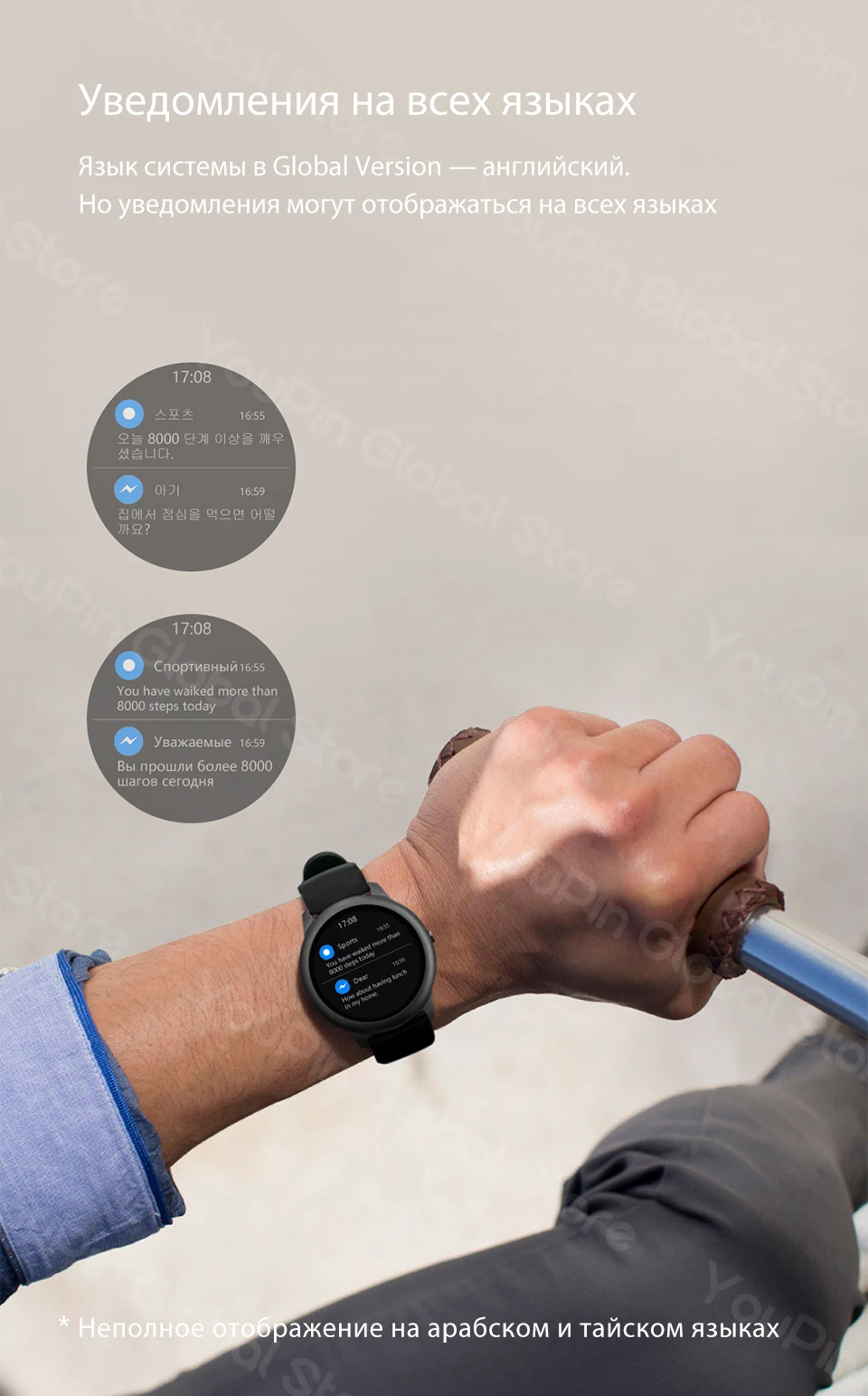 ------ Язык системы международной версии часов (Global Version) — английский. Но уведомления могут отображаться на разных языках: русском, японском, французском, немецком, китайском, испанском и португальском ------