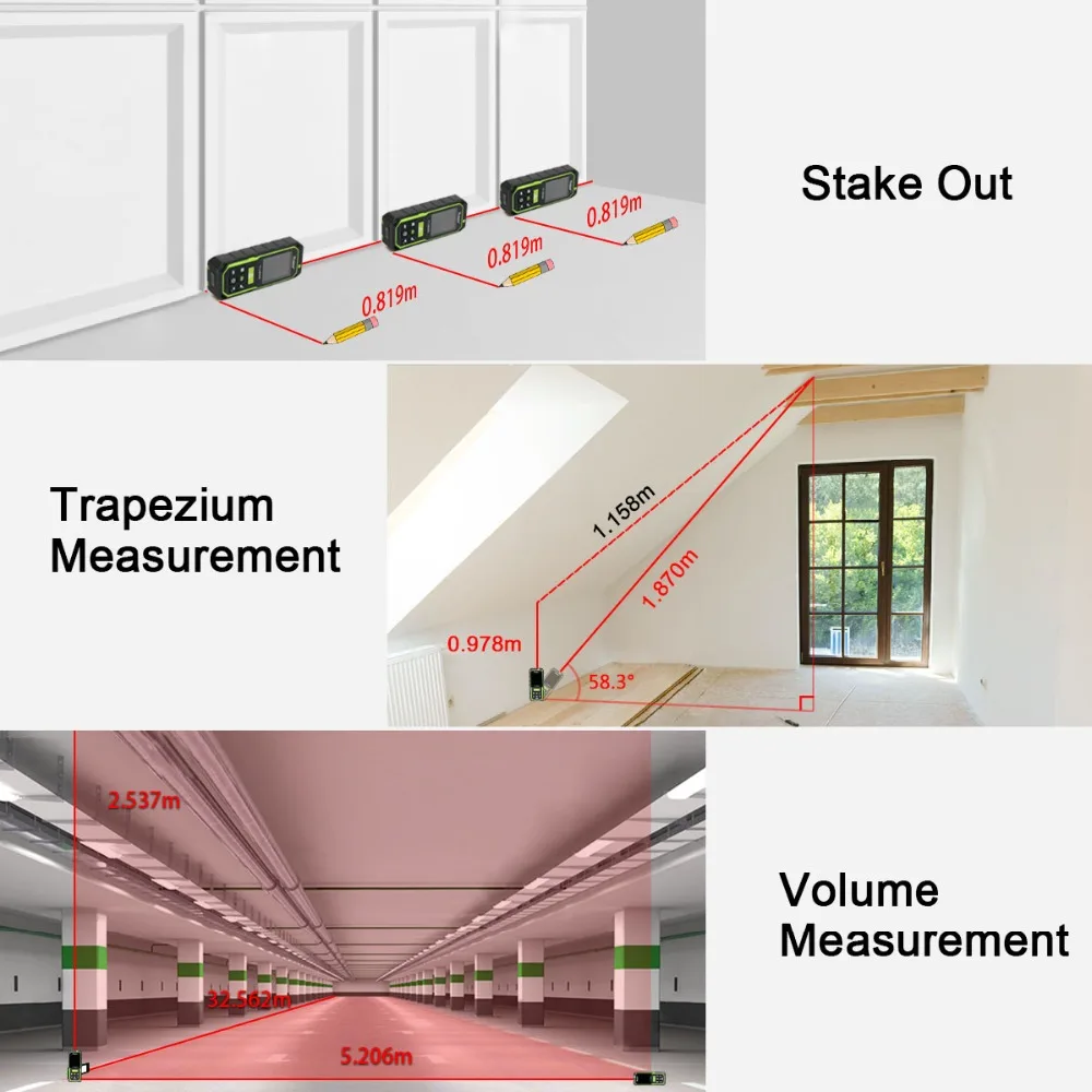 При установке и маркировке позиций для каркаса гвоздей или других количеств функция stake out помогает вам сэкономить время и повысить точность.Функция трапеции полезна для определения длины и наклона секции крыши, а также площади, которую она охватывает.Измеритель использует внутренний датчик наклона для расчета угла и расстояния между кадрами, что означает, что вы можете измерить крыши более точно от земли.Помимо измерения объема Куба, измеритель также имеет функцию измерения объема цилиндра.