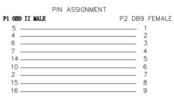 9 Pin DB9 serial RS232 female plug and a 16 Pin OBD 2 male plug.