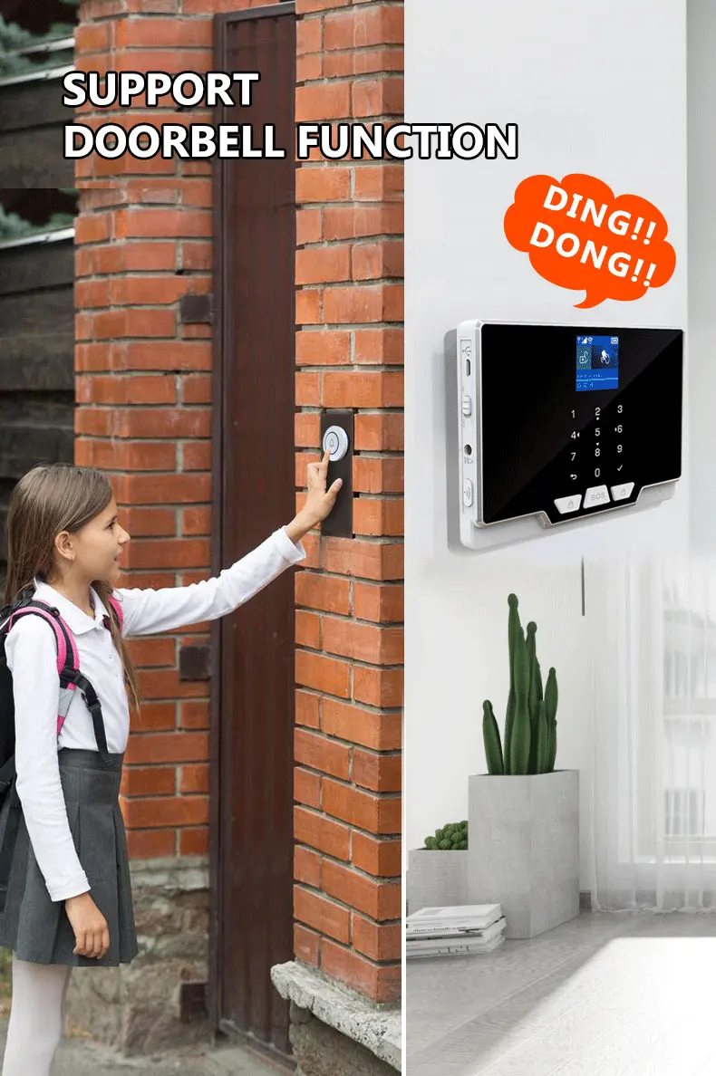 Поддержка функции дверного звонка. Вы можете установить беспроводную кнопку в качестве функции дверного звонка. Просто нажмите кнопку, Хост сигнализации сделает звук ding-dong.