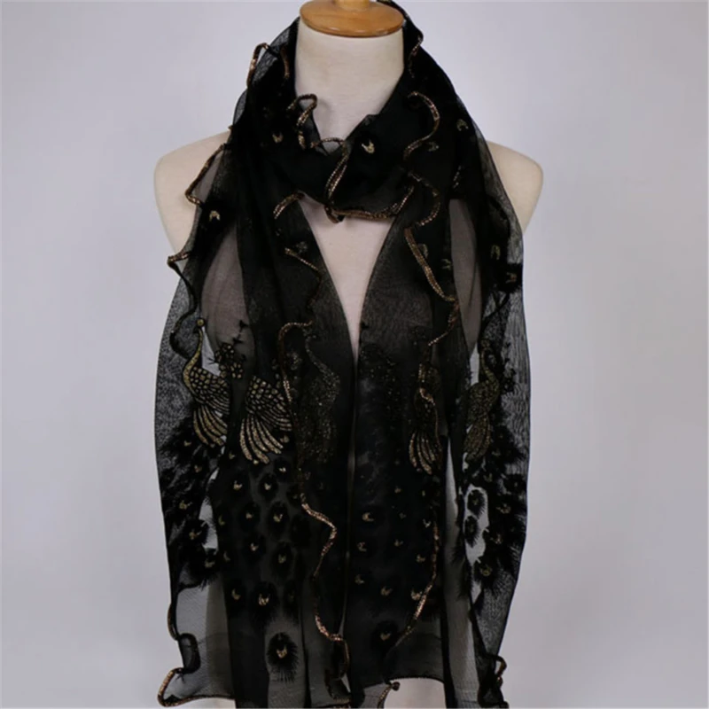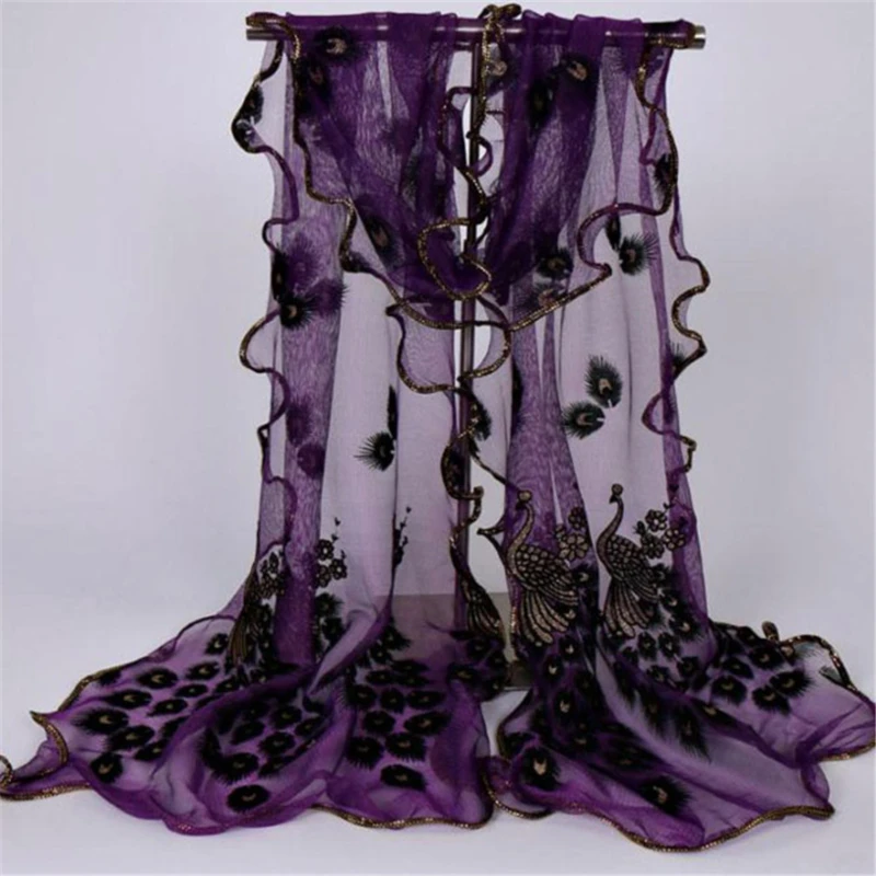 Новый дизайн женский шифоновый павлиньи перья цветы вышитый кружевной стильный шарф длинный мягкий платок женский шарф