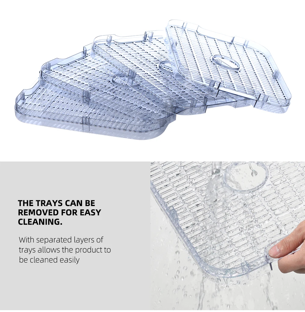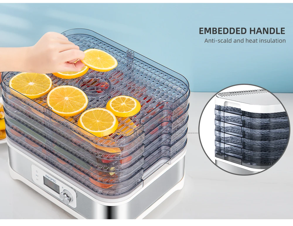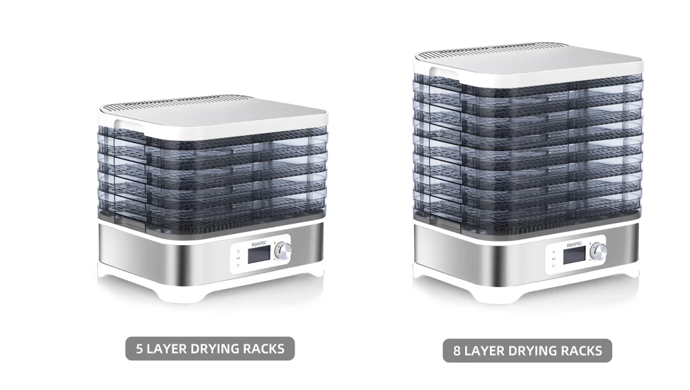 ROSPEC Food Dehydrator FD-1200E разработан с 8 сушильными стеллажами большой вместимости, что достаточно для хранения большинства пищевых продуктов и создания равномерной сушки