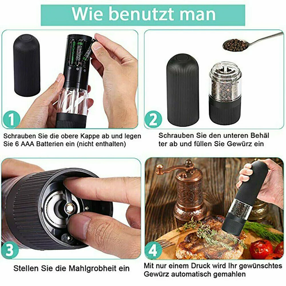 -【Легко переносить: Эта портативная автоматическая мельница позволяет легко брать с собой. Подходит для кемпинга, пикников и даже барбекю. -【 Светодиодный светильник и батарейный блок 】: даже в темной среде светодиодный светильник может точно отображать количество специй. Питание от 3 батарей AAA. (Батарейки в комплект не входят) -【Регулируемая грубость 】: регулируемый механизм грубости позволяет выбрать толщину от сверхтонкой до грубой. Просто согните дно мельницы для соли и перца, чтобы получить шероховатость, которую вы хотите. -【Одна Кнопка работы: просто нажмите кнопку на электрической мельнице для перца, и она автоматически начнет шлифование. Быстрая и эффективная. -【Широкое применение 】: подходит для измельчения мелких специй, таких как перец, кукуруза, семена горчицы, соль, кристаллы морской соли, сушеные травы или специи.