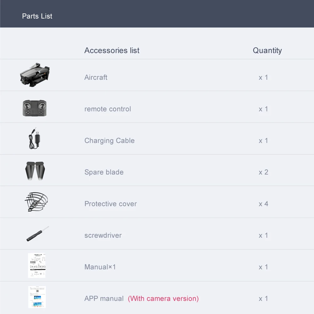 Функции s: вверх/вниз, вперед/назад, влево/вправо, боковой полет, светодиодный свет, режим Безголового движения, автоматическое возвращение с одной клавишей, режим удержания высоты, wiFi FPV (двойной объектив с двойной функцией переключения объектива)