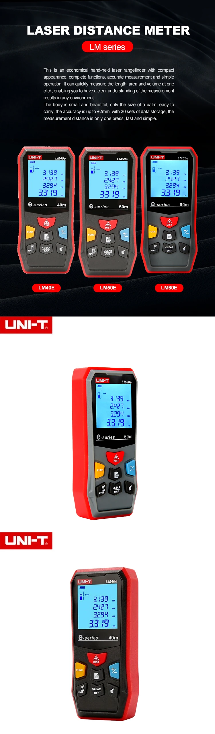 Specifications LM40e LM50e LM60e Display type LCD Display size 1.8-inches Range 40m 50m 60m Min. display unit m/ft/in/ft+in Measurement units Front/rear Accuracy ±2mm Laser class 2 Laser type 630~670nm, ﹤1mW Features Single measurement √ Continuous measurement √ Max/Min/Area √ Volume/Pythagoras √ Add/Subtract √ Data storage 20 groups Auto laser off 30s without operation Auto power off √ Battery status display √ General Characterisitics Power 1.5V battery (LR03) x 2 Product color Red and grey Product net weight 106g Product size 110mm x 52mm x 28mm Standard accessories Carrying bag Standard individual packing Gift box, English manual Standard quantity per carton 60pcs Standard carton measurement 420mm x 295mm x 355mm Standard carton gross weight LM40e/50e: 11.8kg; LM60e: 12.4kg