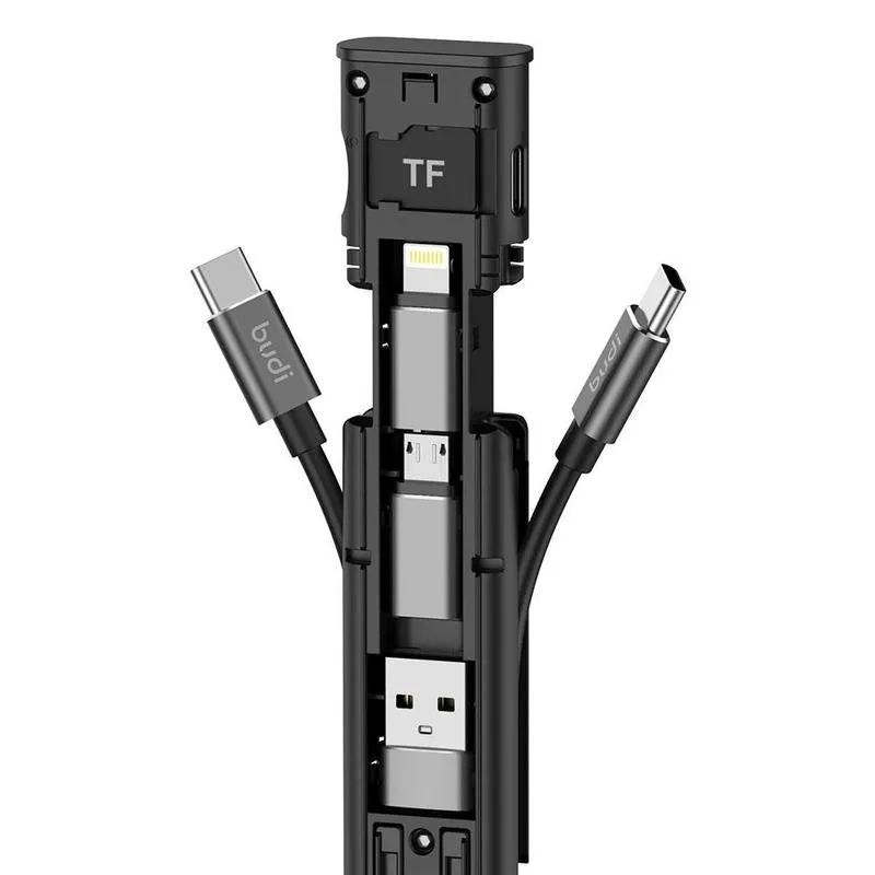 Многофункциональная кабельная палка budi является революционной конструкцией, которая объединяет все основные и наиболее часто используемые кабели соединителей; кабель типа C-Type C около 29 см с 3 адаптерами типа s, которые составляют до 6 кабелей различного типа s.
