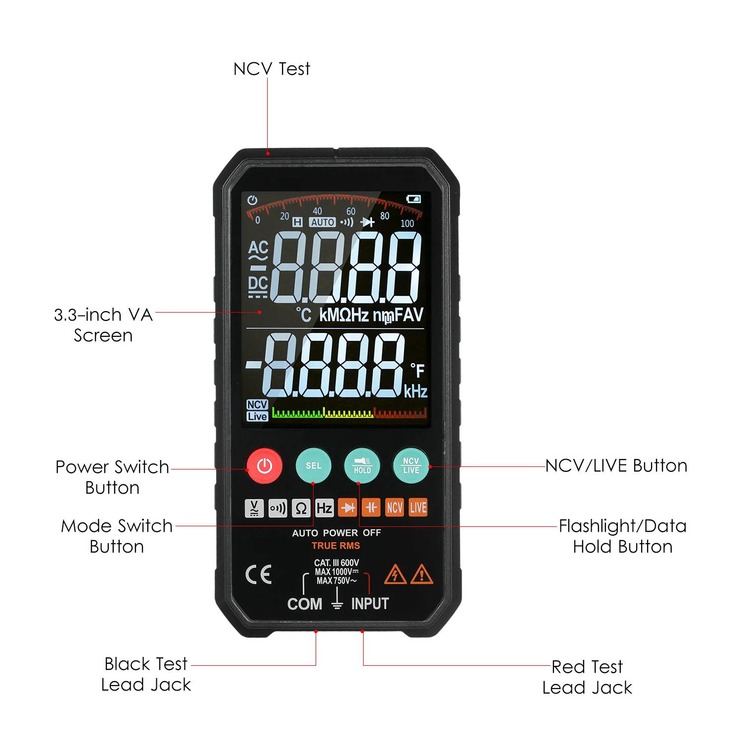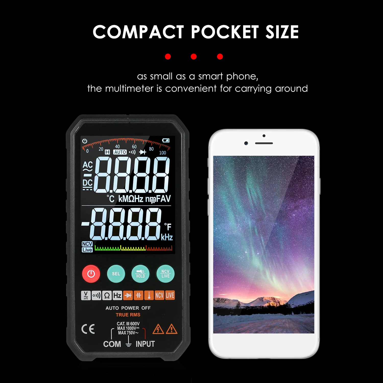 Компактный размер кармана: маленький, как смартфон и Питание от 2 шт. AAA батареи (не входят в комплект), мультиметр удобен для переноски. Прилагается чехол для хранения, на молнии для эффективно защитить мультиметр от повреждений.