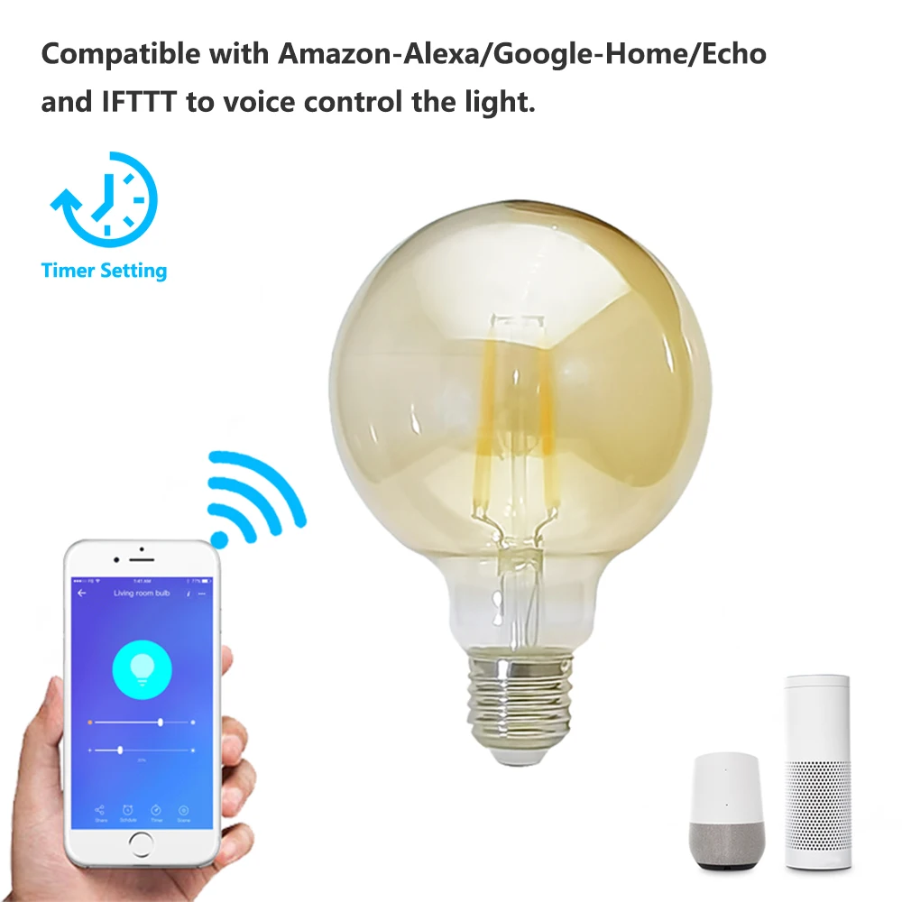 Особенности:2200k теплый белый до 6000k холодный белый с регулировкой яркости для идеальной яркости. Только в том случае, потребляет всего 7,5 Вт, 80 Вт галогенной лампы, экономя ваше до 85% в затраты на электроэнергию. Поддерживается функция управления Wi-Fi, вы можете загрузить приложение и работать в соответствии с инструкцией по реализации дистанционного управления. Совместим с Amazon-Alexa/Google-Home/Echo и IFTTT для голосового управления светильник. Вы можете установить таймер, изменение светильник цвет и яркость, выбирайте определенные режим сцены через приложение. Универсальный E26/E27 цоколь лампы на ваш выбор, полностью фитинг с Вашим домом. Может использоваться в люстр, настольных лампах, потолочный светильник, светильник коридора, торшер, настенные светильники и т. Д.Характеристики:Материал: стеклянная лампа Тип: G95 Вход: AC110-120V(E26); AC220-240V(E27)(Опционально)Мощность: 7,5 W СИД освещения температуры: 2200-6000k затемнения: Да (лм): 810lm ультратонкое естественное освещение CRI: Ra80 (красный, зеленый, синий) Угол пучка: 270 ° Wi-Fi: 2,4 ГГц IEEE 802.11b/g/n защиты скорость передачи данных: IP20 (чип на плате) Срок службы: 30000 h Вес лампы: 45 г/1,59 Унция Размер лампы: 95*138 мм/3,74*5,31 в посылка Вес: 102 г/3,6 Унция Размер посылка: 100*100*144 мм/3,94*3,94*5,67 дюймовПримечание:Требуется 2,4 ГГц подключения к сети Wi-Fi и Android4.4 выше или iOS9.0 или выше.Упаковочный лист:1 * Лампа 1 * Руководство пользователя