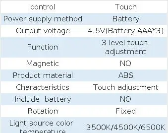 Напряжение: 5V ~ 50 Гц 0.022A Номинальная мощность: 0,4 W Цвет температура: 2400K ± 96K Управление метод: светочувствительная + сенсорный выключатель Сенсор диапазон: 3-7 м Время задержки: 30 секунд Рабочая температура: -10 - + 40 °C Размер: 65 65*38 мм