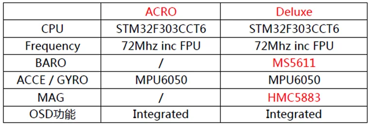 SP Racing F3 flight control integrated OSD Acro Standard Edition Deluxe Edition с корпусом Два варианта управления полетом интегрированный OSD список доставки: Управление полетом интегрированный OSD (ACRO или DELUXE опционально) x1 + изысканный корпус x1 + выделенный CP2104 управление полетом/OSD программная горелка + 4 соединительных провода + несколько контактных заголовков Напоминание: доставка не припаянная штыревой разъем, пожалуйста, обратите внимание Разница в конфигурации между F3 flight control integrated OSD Acro Standard Edition и Deluxe Edition: