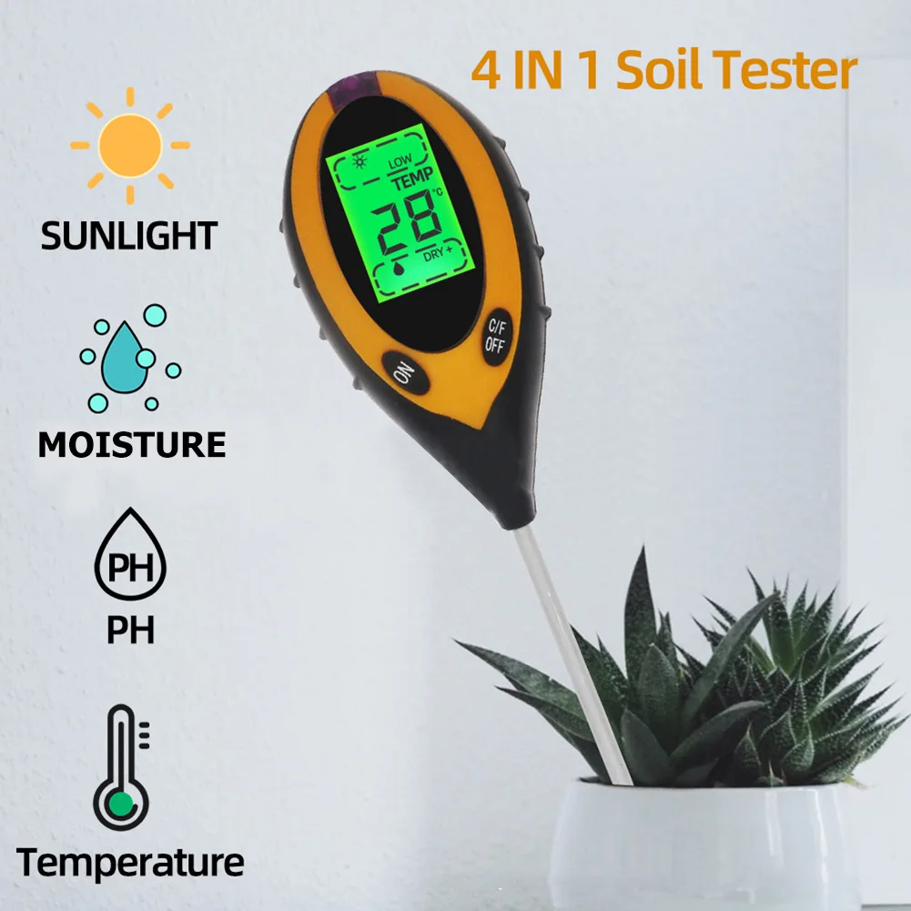 Электронный цифровой ЖК-дисплей с питанием от аккумулятора 4 в 1, прибор для испытания почвы pH, светильник для измерения температуры влаги, анализатор, измерительный прибор для садовых растений и цветов