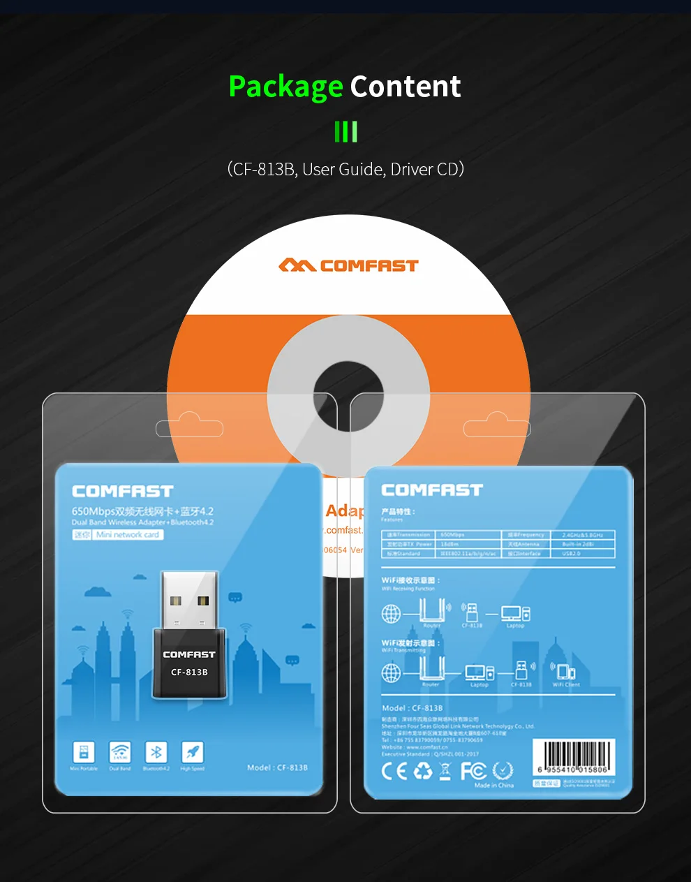 9. Other Function: Soft AP function10. Size: 27*16*7mm11. Support OS: Windows 7 / 8 / 8.1 / 10 , MacOS10.6~MacOS10.15 ( Note: Bluetooth driver does not support Windows XP/Vista/MAC) Packing List1* Wireless Adapter1* Quick Installation Guide1* CD Wifi & Bluetooth Wireless Network Card , Dual Band 650Mbps , BT4.2Connect PC with Bluetooth mouse / keyboard / game consoler