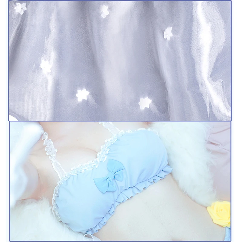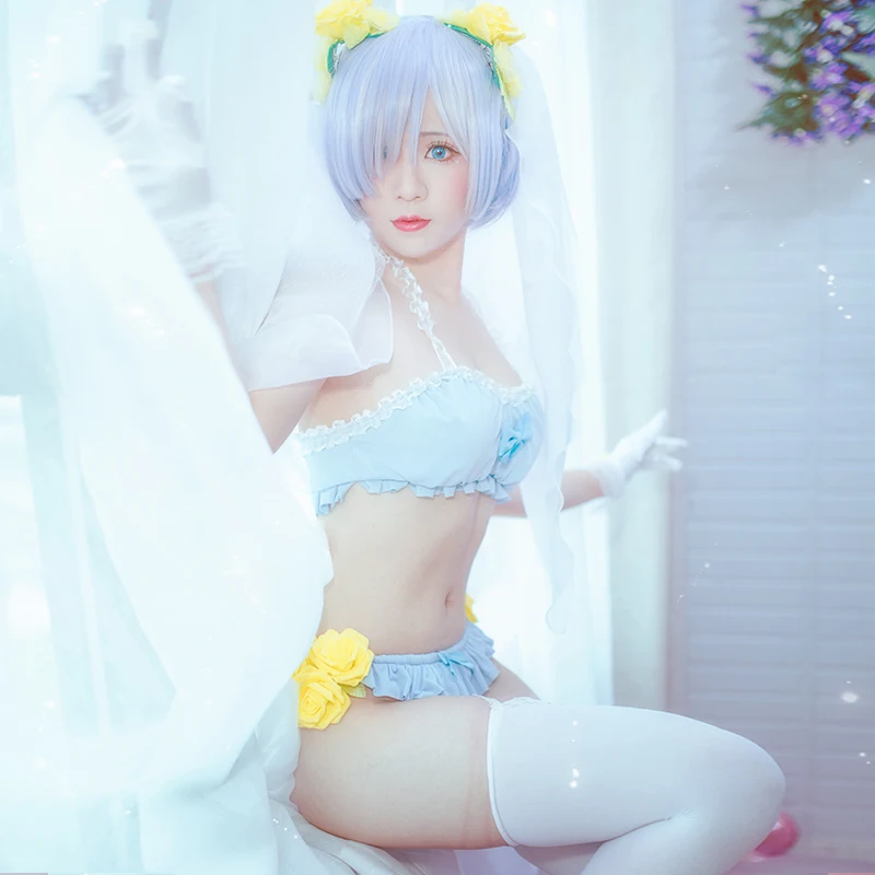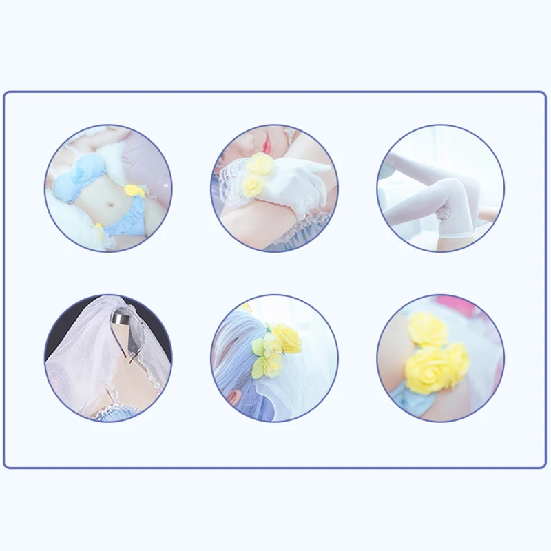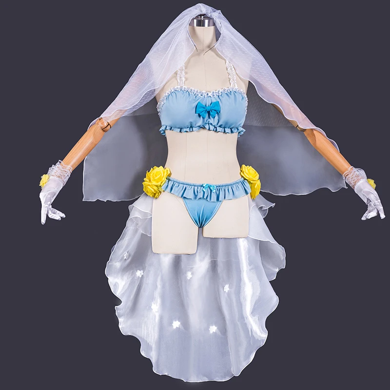 Костюм:BIkini трусы + бюстгальтер бикини + перчатки + чулки + желтый цветок + головной убор + вуаль
