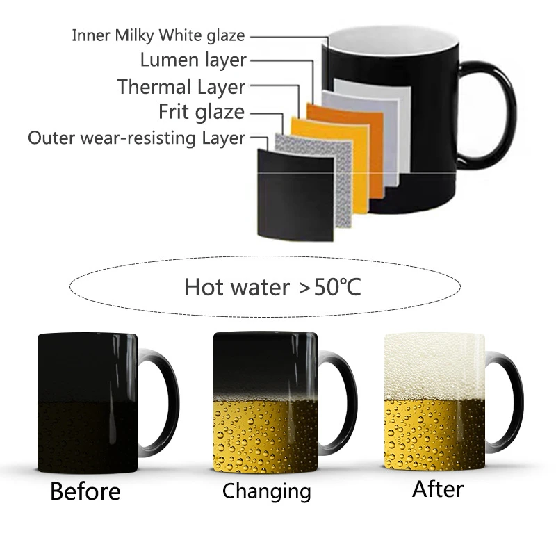 Меняющие цвет чернила, используемые в чашке для изменения цвета, не токсичные, не загрязняющие окружающую среду чернила, синтезированные из биологического материала. Их принципы: термочувствительный материал напечатан на корпусе, этот материал термостойкий 320 ℃, нетоксичный, без свинца, без хрома, пожалуйста, будьте уверены в использовании.