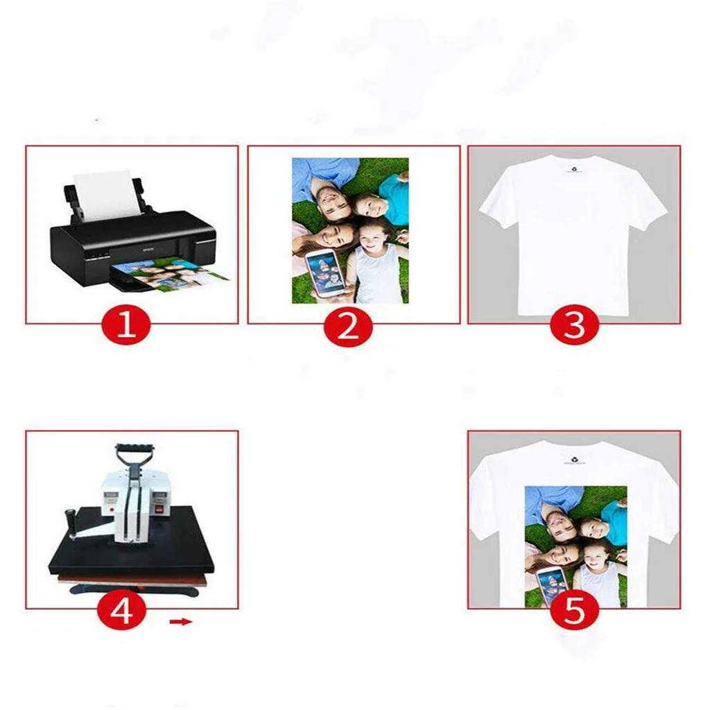 Первый: печать 1. Настройка принтера. Рекомендуется выбрать режим «качество фото струйная бумага» для удовлетворительного Результаты печати. 2. Печать желаемого изображения На переводную бумагу. Затем Оставьте его высохнуть около 10 минут 3. Вырежьте изображение, Оставляя Узкий край 5 мм по краям узора Второе: передача 1. Подогрев теплового пресса Установка и установка рекомендуемой температуры передачи до 165 °C 2. Снимите основание Бумага Из напечатанного покрытия, и покрытие останется как пленка Материал 3. Поместите покрытие изображения На текстильной, напечатанной (изображение) стороне вверх 4. Положите изоляционную бумагу На изображении блестящая лицевая сторона вниз 5. Передача для 15-30 Секунд, затем извлеките текстиль из машины, очистите изоляционную бумагу После охлаждения. Третье: стирка 1. Лучше не стирать Текстиль в течение 24 часов после передачи 2. Стирка текстиля в Холодная или 30-40 °C вода. Не стирать С сильно щелочным Моющие средства, не отбеливать. Избегайте трения Переданный узор, когда Ручная стирка. 3. Не отжимать, сушить в линии В тени рекомендуется 4. Не подвергать химической чисткеПримечание: