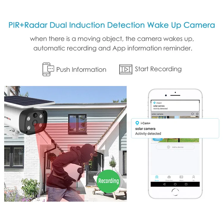 ПИР + радар Двойной индукции обнаружения пробуждения камерыКогда есть движущийся объект, камера просыпается, автоматическая запись и напоминание информации о приложении