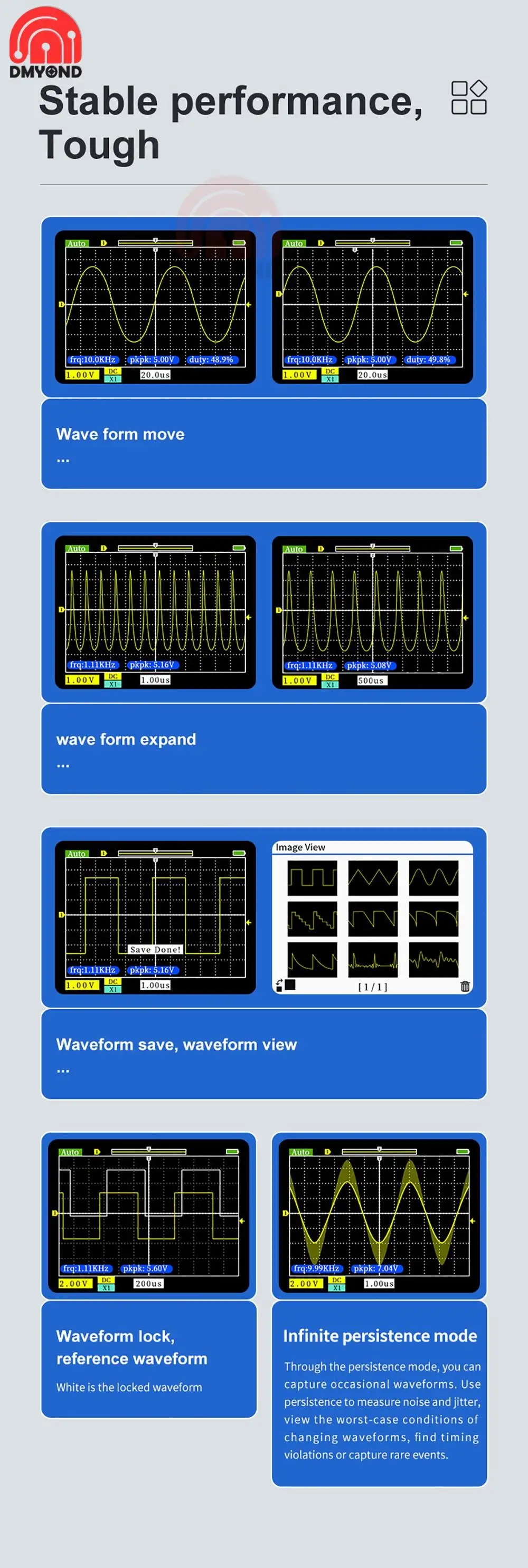 FNIRSI-1C15-это полностью функциональный, практичный и экономичный портативный осциллограф, недавно запущенный FNIRSI. Частота дискретизации в реальном времени составляет 500 м, а аналоговая полоса пропускания-110 МГц. В дополнение ко всем функциям Обычного Ручного осциллографа, мы также добавили на этой основе одну функцию быстрого авто, так что вы можете легко захватывать форму волны, как настольный компьютер. Мы добавили 1k Hz само-тест квадратной волны для FNIRSI-1C15, и глубина хранения была модернизирована до 12kpts. Со ссылкой на форму волны, вы можете сделать паузу в любое время, чтобы сохранить предыдущую форму волны на экране, и вы можете сравнить его с обновленной в настоящее время формой волны. Режимы Afterglow и прокрутки упрощают Обнаружение и запись сигналов. Встроенный аккумулятор емкостью 3000 мАч может работать непрерывно более 10 часов после полной зарядки. Корпус оснащен высококачественной силиконовой втулкой, которая не скользит и не скользит. Джойстик заменяет оригинальные клавиши со стрелками, что делает работу более простой и эффективной.