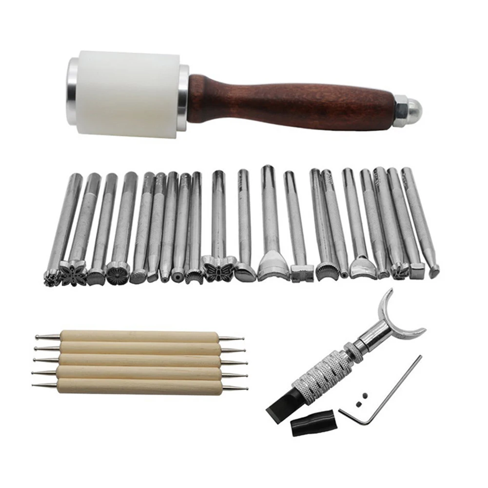 1. Изготовлен из легированной стали более прочный и прочный, не легко деформируется и ломается. 2. Несколько узоров: каждый инструмент имеет различные узоры, такие как бабочки, цветы, отверстия, половина Луны и т. Д., которые сделают кожу более красивой и особенной. 3. Противоскользящая ручка с резьбой в полоску на ней, которая является более стабильной при использовании, делает работу более эффективной. 4. Применение: эти инструменты ручной резьбы специально разработаны для кожаных изделий или других дизайнов DIY. 5. Полный набор инструментов. Поставляется с молотком, шариковой ручкой и необходимыми инструментами для печати