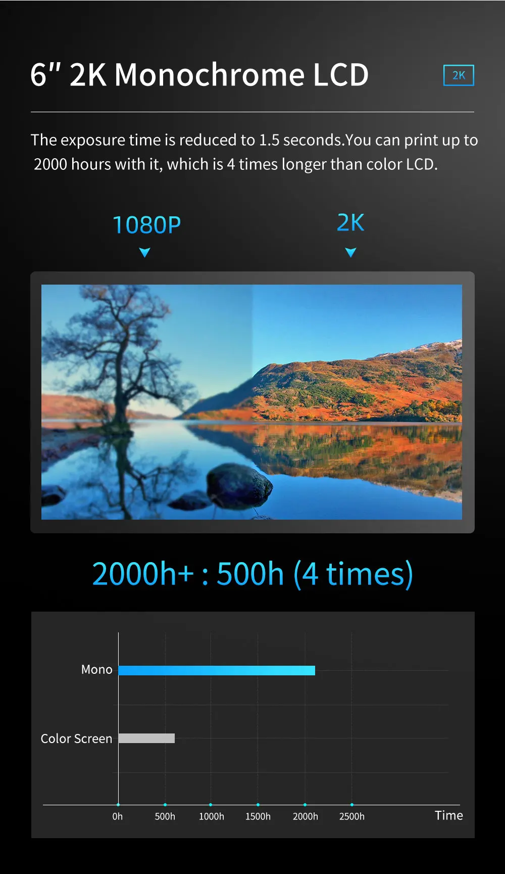 Более длительный срок службы: вы можете напечатать его до 2000 часов, что в 4 раза дольше, чем цветной ЖК-дисплей.