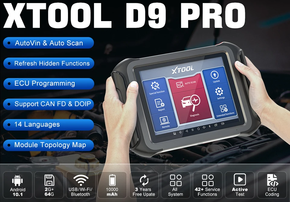 XTOOL D9 Pro представляет собой oe-уровня полный диагностический сканер по мере того как оно может сканирования ECUs в различных типов транспортное средство системы и подсистемы, такие как двигатель, TCM (коробка передач), ПП (подушка), АБС-пластик, система контроля давления в шинах, BCM, тела, переменный ток, и многое другое, чтение/очищает коды, просматривайте трансляцию в прямом эфире с данных от каждого доступная система, выполнять активные тесты, чтобы проверить статус работы модули