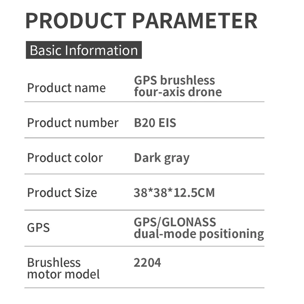 Наименование товара: MJX B20 EIS Колесная база: 280 мм Размер квадрокоптера: 380*380*125 мм Вес квадрокоптера: 543 г Максимальная скорость подъема: 3 м/с Максимальная скорость спуска: 2 м/с Максимальная скорость полета: 40 км/ч Максимальное время полета: 22 минуты Макс. Предельная Высота: 120 м Макс. Полет Расстояние: около 600 м Сопротивление ветра Уровень: <4 уровня Мотор: 2204 1620кв Бесщеточный двигатель ESC: 6A бесщеточный Встроенный позиционирование Датчик: GPS/оптический поток/барометр EIRP: 20dbm Пульт дистанционного управления Рабочая частота: 2,4G Максимальный пульт дистанционного управления Расстояние управления: 600 м Батарея передатчика: 1,5 V 2 X AA (не входит в комплект) Название приложения: M RC PRO Эффективные пиксели: 4K Максимальная передача Частота кадров:720P 30 кадров в секунду Передача видео Система: 5G WiFi (802,11. ac) Передача изображения Диапазон: 450 м Угол Линзы: 130 ° Диафрагма: f/2,0 Фокусное Длина: 2,8 мм Датчик: 1/3 дюйма CMOS Местная видеокамера Скорость: 3840x2160 30 кадров в секунду1080P 60 кадров в секунду Файловая система: FAT32 Скорость затвора: 1/30s-1/10000s Диапазон ISO: 100 - 3200 Для видео/фото Регулируемая камера Угол: от 0 до-90 ° Макс. Фото Разрешение: 3840*2160 Максимальное видео Разрешение: 3840*2160 Шарнир: одноосный Карданный шарнир Поддерживаемые sd-карты: Micro SD карта класса 10 и выше (не входит в комплект) Макс. Расширение: 128 ГБ Батарея Наименование товара: 7,6 В 3400 мАч Lipo батарея Емкость: 3400 мАч Напряжение: 7,6 В Вес батареи: 152 г Операционная система Температура: от 5 ℃ до 40 ℃ Время полета: около 22 минуты Время зарядки: около 5h Вход: 5 В/2-2,1 А Тип зарядки: Зарядный кабель Type-c Вес и размеры Вес изделия: 543 гОсобенности: