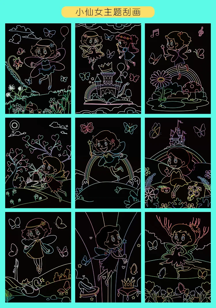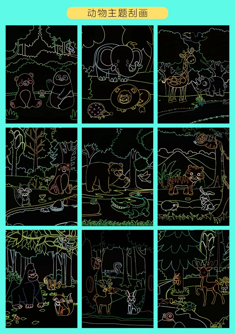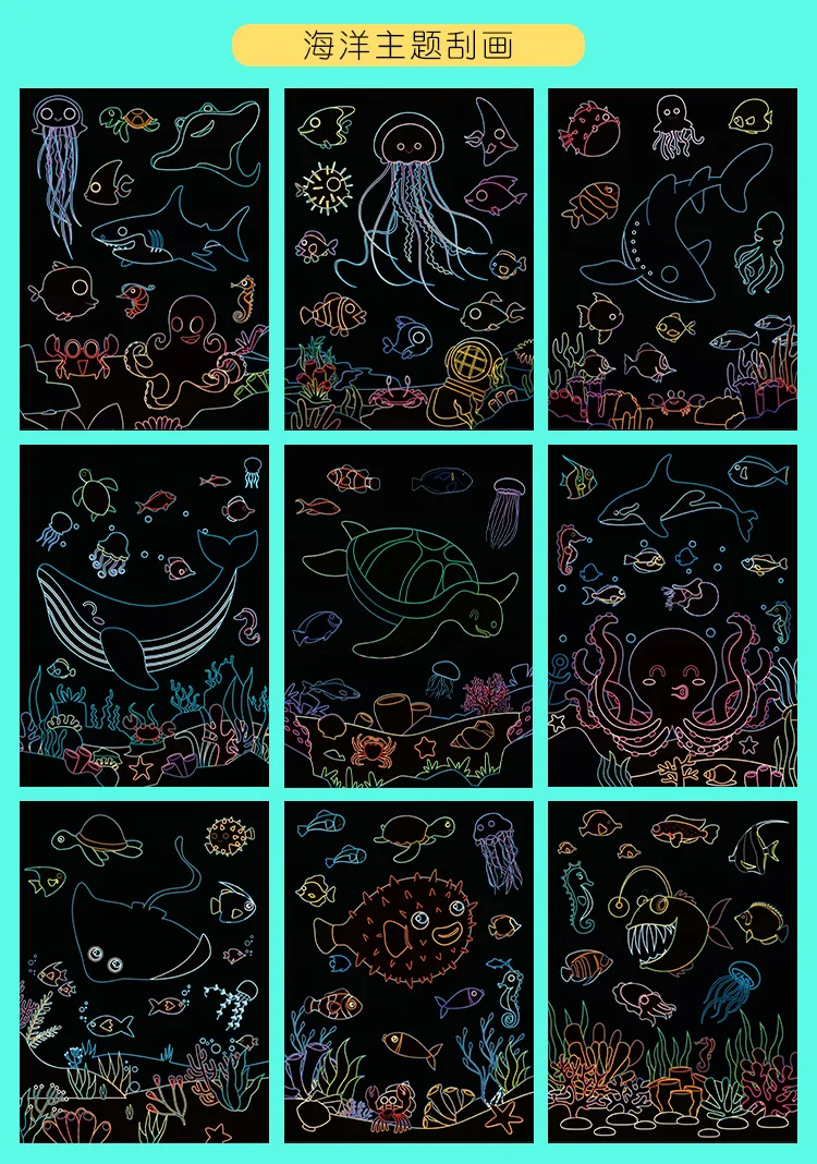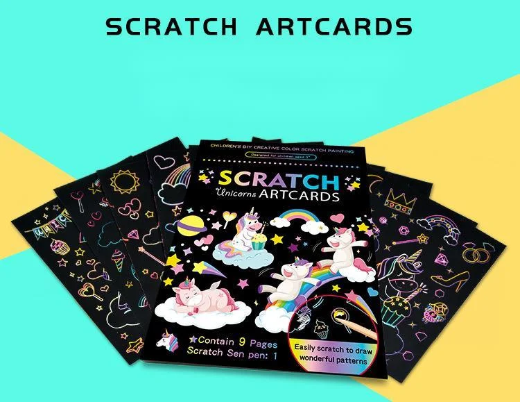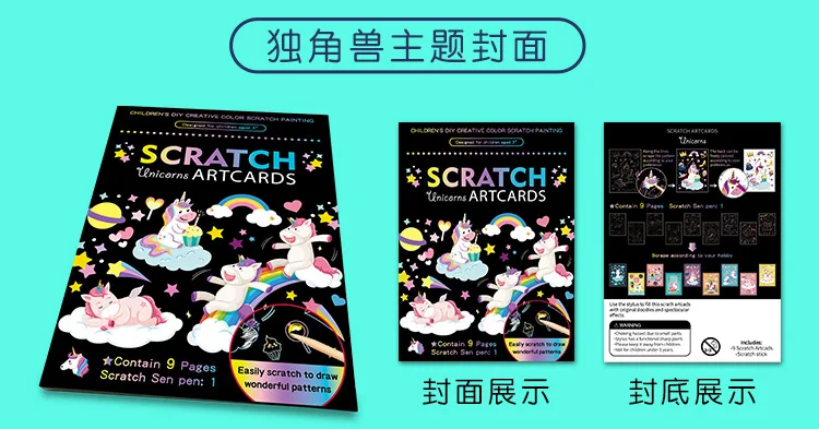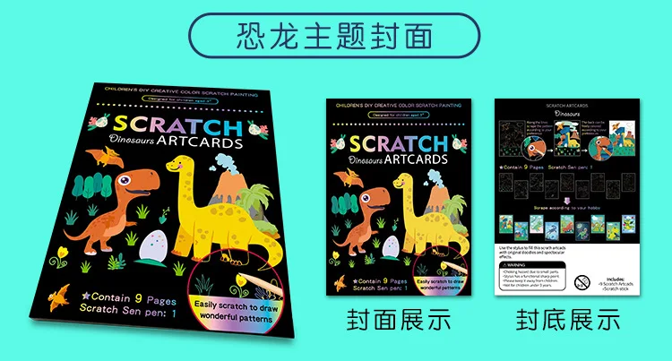 -Название продукта: 9 шт. Волшебная Радужная цветная бумага для живописи, набор для карт, мультяшный динозавр, единорог, доска для рисования, детские развивающие игрушки DIY